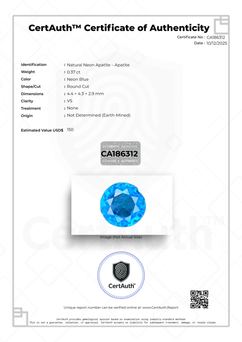 0.37 CT ROUND CUT NATURAL NEON APATITE - NEON BLUE HUE (CERTAUTH CERTIFIED) This Auction Features A Vibrant 0.37-Carat Natural Apatite Displaying A Striking Neon Blue Colour. The Gemstone Is Cut In A Round Shape And Has Vs Clarity. This Earth-Mined Stone Is Untreated, Preserving Its Natural Characteristics. Included With The Purchase Is The Certauth Certificate Of Authenticity. Details: • Gemstone: Natural Neon Apatite – Apatite • Carat Weight: 0.37 Ct • Colour: Neon Blue • Cut: Round Cut • Clarity: Vs • Treatment: None • Metal: N/A (Loose Gemstone) • Dimensions: 4.4 X 4.3 X 2.9 Mm • Ring Size: N/A • Origin: Not Determined (Earth-Mined) • Certification: Certauth Certificate (No: Ca186312) • Estimated Value: $150 Usd Condition: Good - Refer Images 0 488395+186312