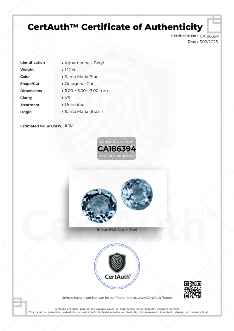 This Auction Features A 1.12-Carat Aquamarine (Beryl) Showcasing The Desirable Santa Maria Blue Hue. The Gemstone Is Fashioned In An Octagonal Cut And Has Vs Clarity. Sourced From Santa Maria (Brazil), This Earth-Mined Stone Is Completely Unheated. It Includes A Certauth Certificate Of Authenticity For Verification.