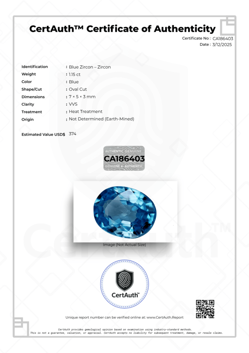 This Lot Features A Sparkling Blue Zircon Weighing 1.15 Carats. The Gemstone Displays A Vivid Blue Hue And Is Shaped In A Classic Oval Cut. It Boasts Excellent Clarity With A Vvs Grading. The Stone Has Been Subject To Heat Treatment To Enhance Its Appearance. This Earth-Mined Gem Includes A Certauth Certificate Of Authenticity.