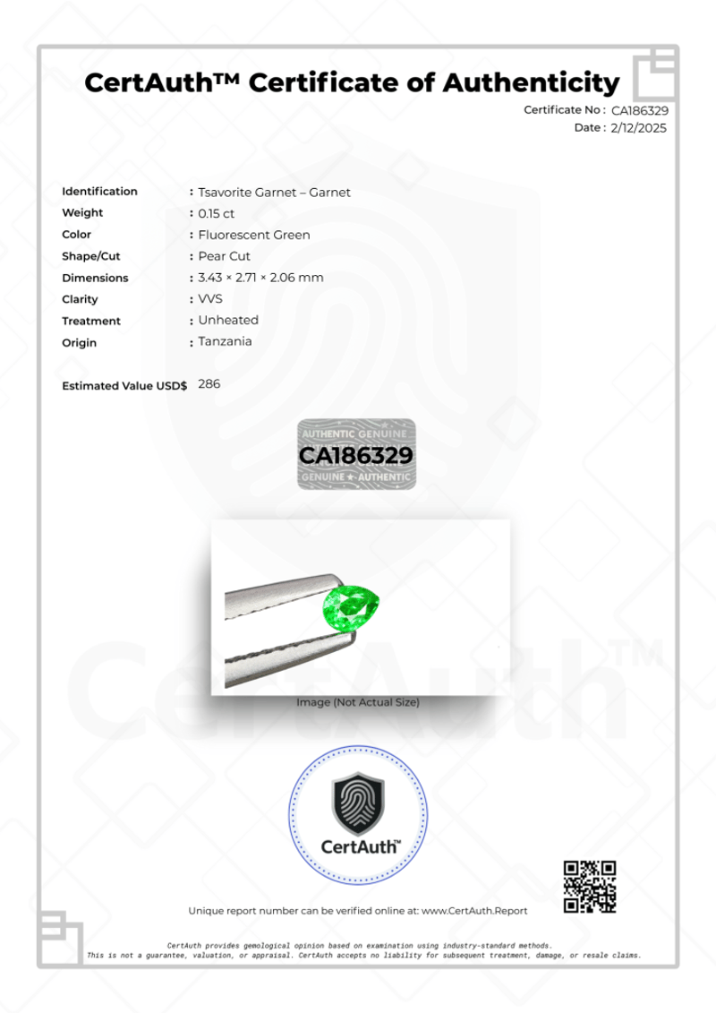 0.15 CT FLUORESCENT GREEN TSAVORITE GARNET - PEAR CUT This Auction Features A Vibrant 0.15 Carat Tsavorite Garnet Mined In Tanzania. The Gemstone Displays A Vivid Fluorescent Green Hue And Is Fashioned In A Pear Cut. With A Clarity Grade Of Vvs, The Stone Offers Exceptional Transparency. It Is Certified As Unheated, Preserving Its Natural Color Without Enhancement. Accompanied By Certauth Certificate Of Authenticity Ca186329.Details:• Gemstone: Tsavorite Garnet – Garnet• Carat Weight: 0.15 Ct• Colour: Fluorescent Green• Cut: Pear Cut• Clarity: Vvs• Treatment: Unheated• Dimensions: 3.43 X 2.71 X 2.06 Mm• Origin: Tanzania• Certification: Certauth Certificate No. Ca186329• Estimated Value: Usd 286 Condition: Good - Refer Images 0488395+186329