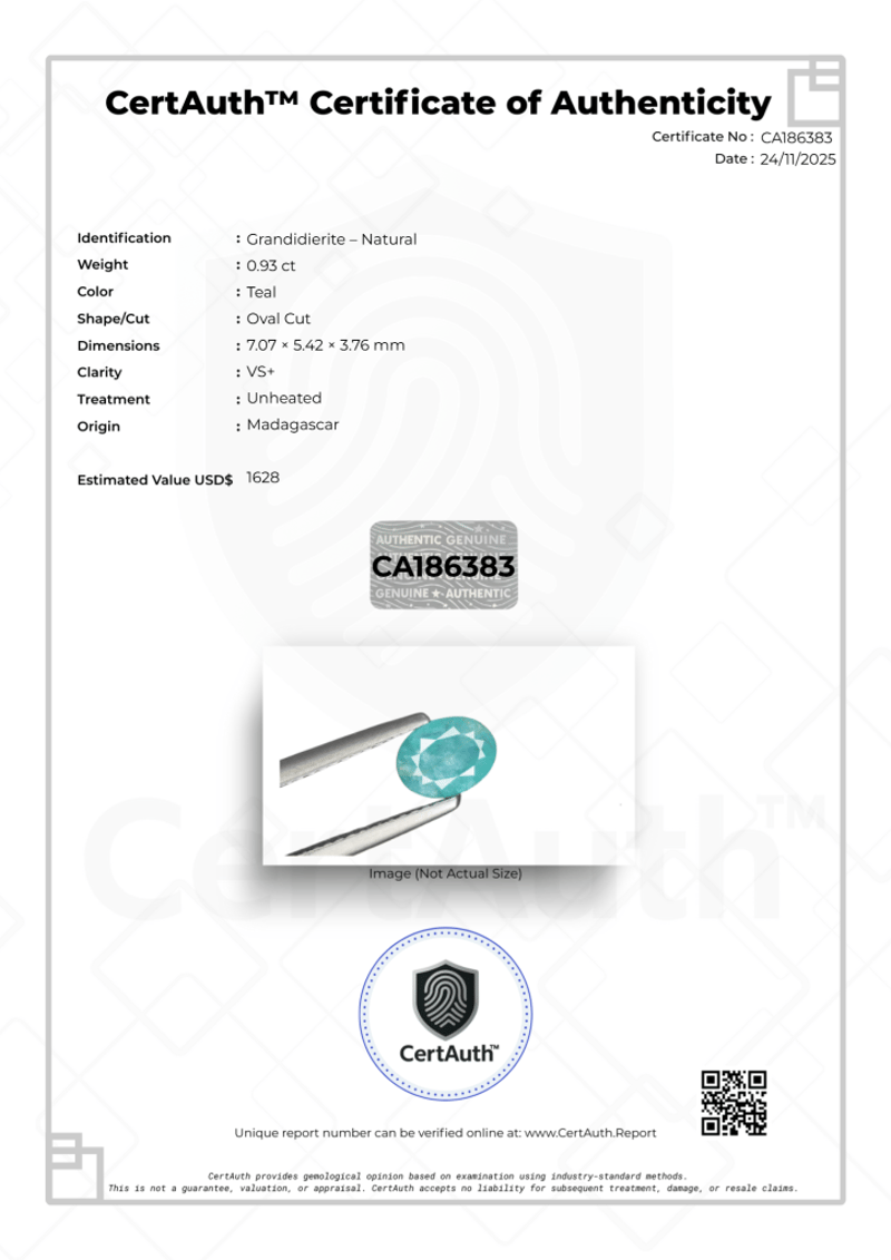 0.93 CT NATURAL TEAL GRANDIDIERITE - OVAL CUT This Auction Features A Rare 0.93 Carat Grandidierite Mined In Madagascar. The Gemstone Displays A Distinctive Teal Color And Is Fashioned In An Oval Cut. With A Clarity Grade Of Vs+, The Stone Offers Excellent Transparency. It Is Certified As Unheated, Preserving Its Natural State Without Enhancement. Grandidierite Is Known For Its Scarcity, Making This A Notable Piece For Collectors. Accompanied By Certauth Certificate Of Authenticity Ca186383.Details:• Gemstone: Grandidierite – Natural• Carat Weight: 0.93 Ct• Colour: Teal• Cut: Oval Cut• Clarity: Vs+• Treatment: Unheated• Dimensions: 7.07 X 5.42 X 3.76 Mm• Origin: Madagascar• Certification: Certauth Certificate No. Ca186383• Estimated Value: Usd 1,628 Condition: Good - Refer Images 0488395+186383