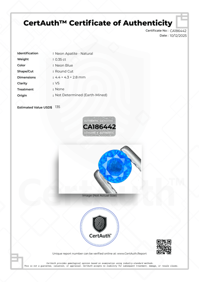 0.35 CT NEON BLUE NATURAL APATITE - ROUND CUT This Auction Features A Vibrant 0.35 Carat Neon Apatite Gemstone. It Displays An Electric Neon Blue Color And Is Fashioned In A Round Cut. The Stone Has A Clarity Grade Of Vs And Is Described As Having Received No Treatment. This Earth-Mined Gem Is Accompanied By Certauth Certificate Of Authenticity Ca186442.Details:• Gemstone: Neon Apatite - Natural• Carat Weight: 0.35 Ct• Colour: Neon Blue• Cut: Round Cut• Clarity: Vs• Treatment: None• Dimensions: 4.4 X 4.3 X 2.8 Mm• Origin: Not Determined (Earth-Mined)• Certification: Certauth Certificate No. Ca186442• Estimated Value: Usd 135 Condition: Good - Refer Images 0488395+186442