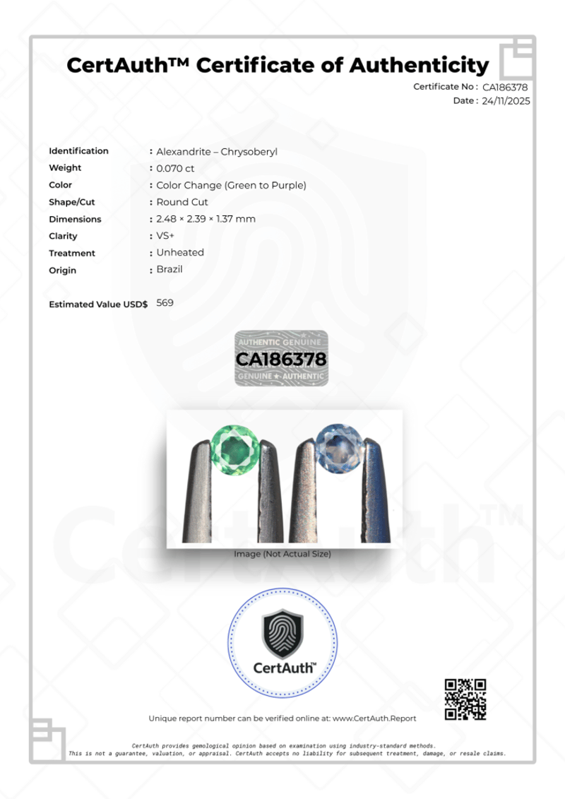 This Auction Features A 0.070 Carat Alexandrite (Chrysoberyl) Sourced From Brazil. The Gemstone Exhibits The Phenomenal Property Of Color Change, Shifting From Green To Purple Depending On Lighting Conditions. Fashioned In A Round Cut, The Stone Possesses A Clarity Grade Of Vs+. It Is Certified As Unheated, Ensuring Its Natural State Has Been Preserved. Accompanied By Certauth Certificate Of Authenticity Ca186378.
