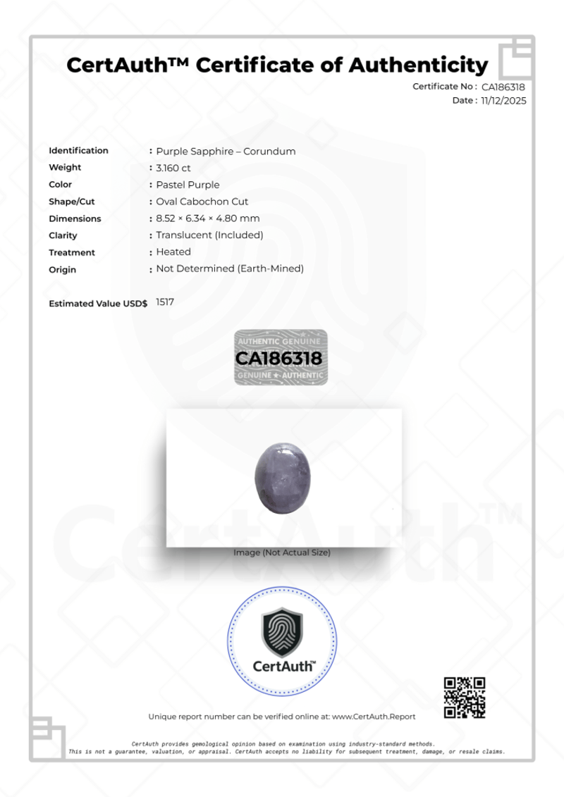 This Auction Features A Substantial 3.160 Carat Purple Sapphire (Corundum). The Gemstone Exhibits A Soft Pastel Purple Hue And Is Cut As A Smooth Oval Cabochon, Distinct From Standard Faceted Stones. The Clarity Is Described As Translucent (Included), Giving The Stone A Glowing, Ethereal Appearance. It Has Been Subject To Heat Treatment. Accompanied By Certauth Certificate Of Authenticity Ca186318.