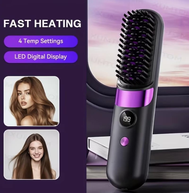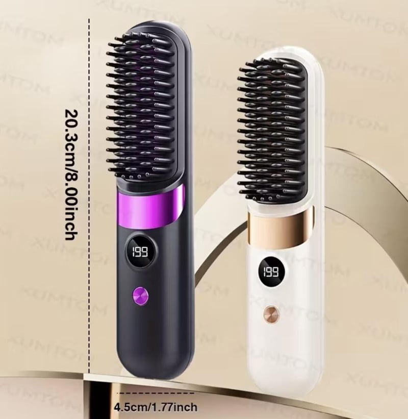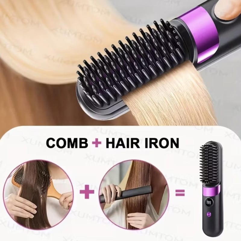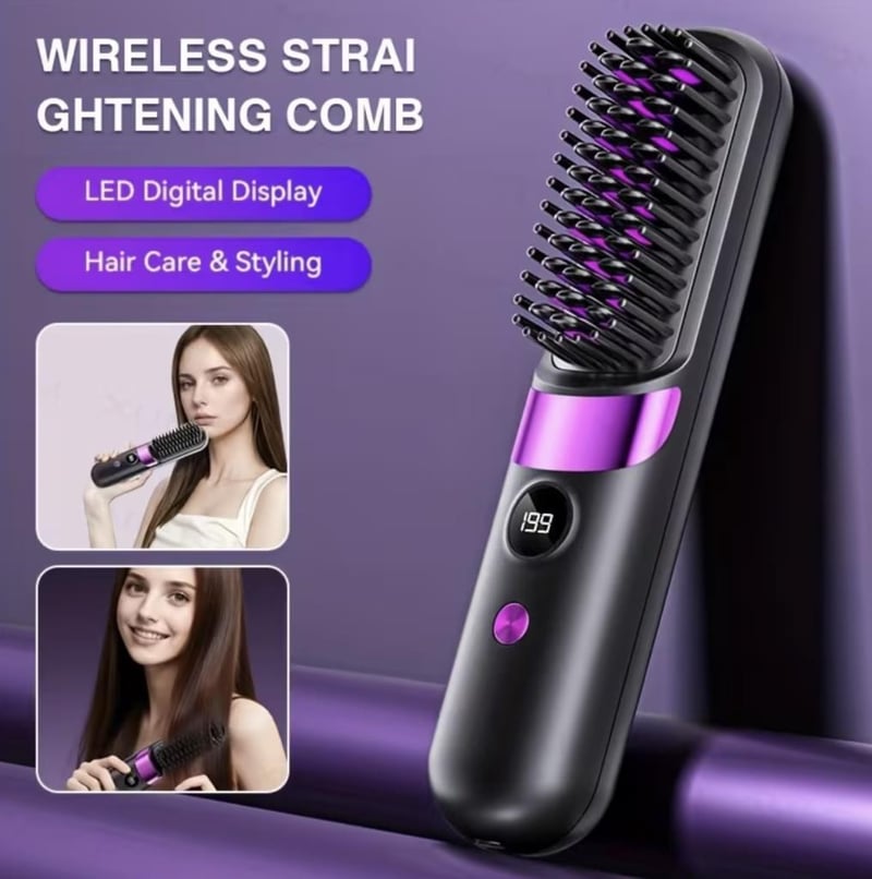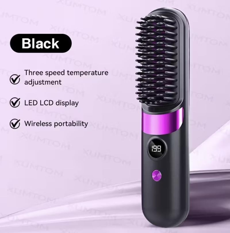 Wireless Straightening and Curling Comb | Quick Heating, Suitable for All Hair Types, Anti-scald Design with LED Display, USB Rechargeable, Auto-Off Feature, Portable for Home and Travel, Stylish Grip, Black