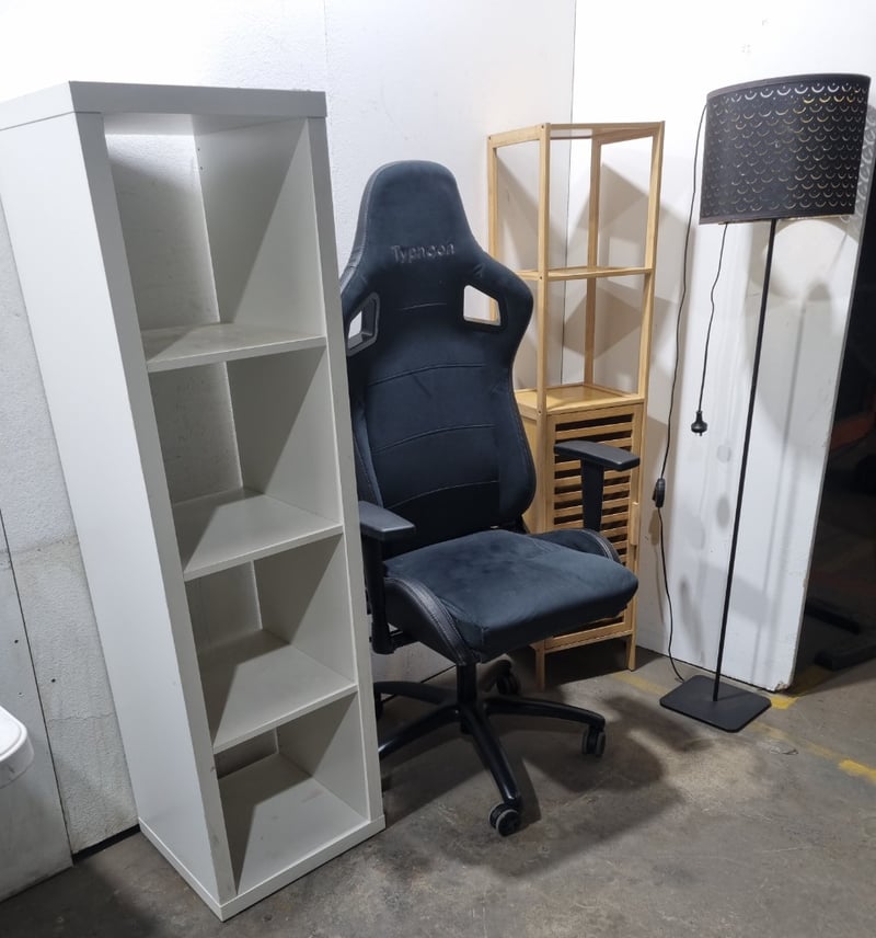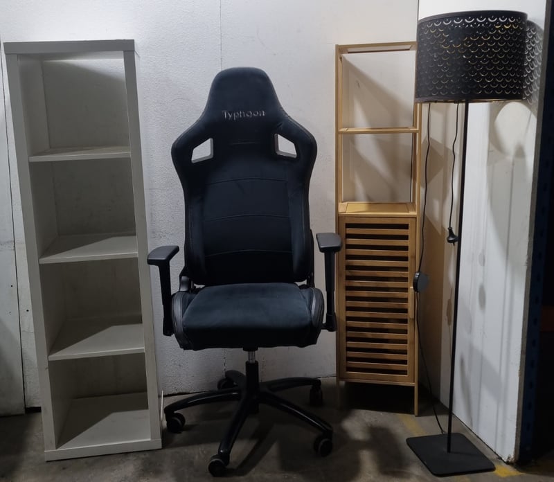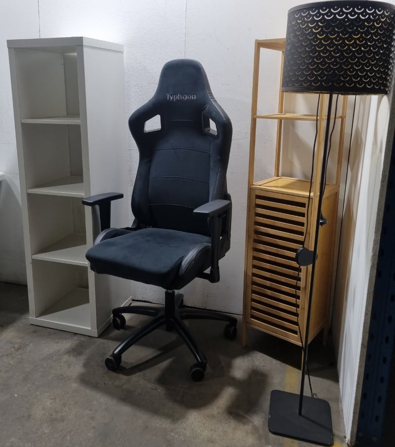 Premium Typhoon gaming chair in black with padded seat and backrest, featuring adjustable armrests and height-adjustable mechanism. Paired with white 4-shelf storage unit and natural wood-tone shelving cabinet with louvred lower section and decorative black patterned cylindrical floor lamp. Comprehensive home office or gaming setup bundle.