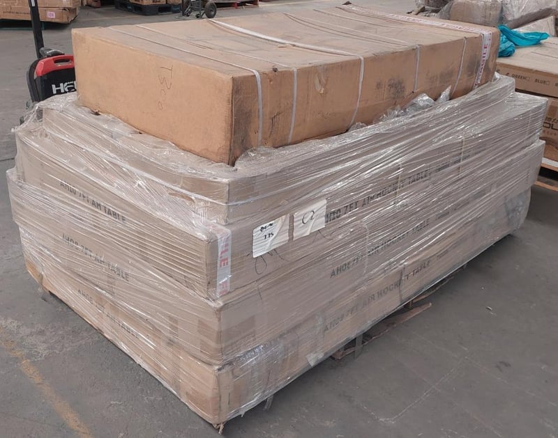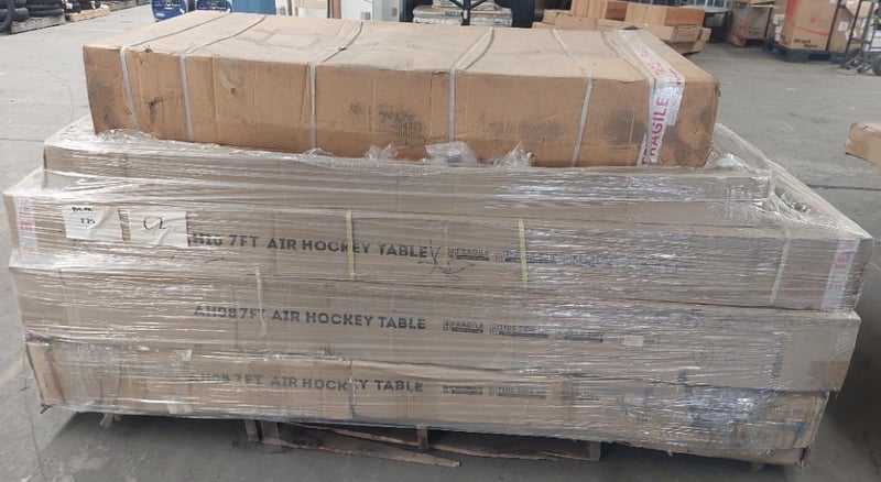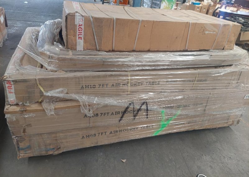 Assorted items, including 7ft air hockey table.Bid per pallet.