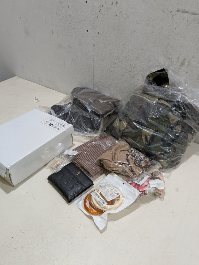 Assorted clothes and shoes different sizes, military women dress, brown boats and more..Sold as a lot