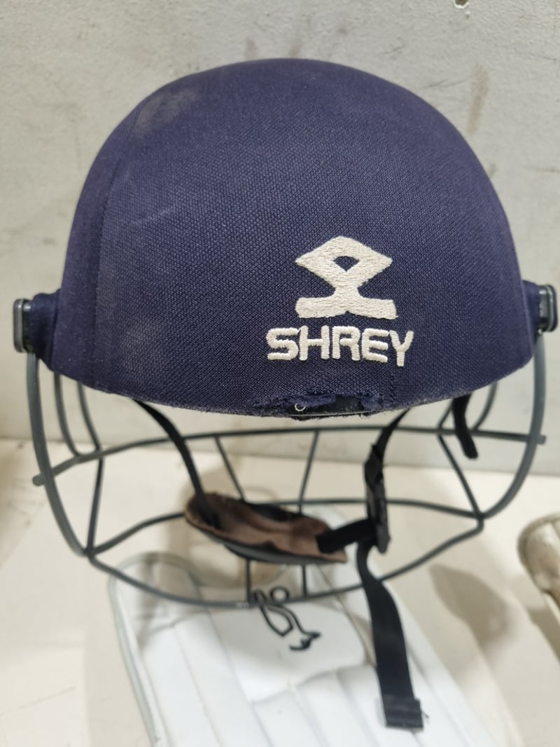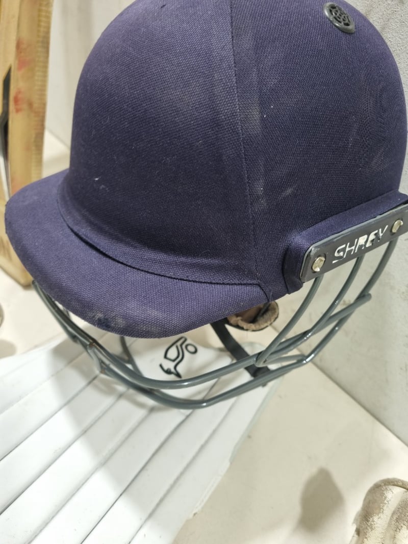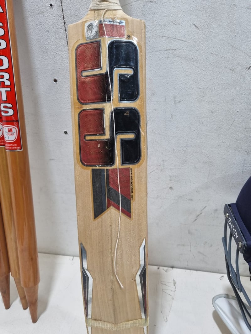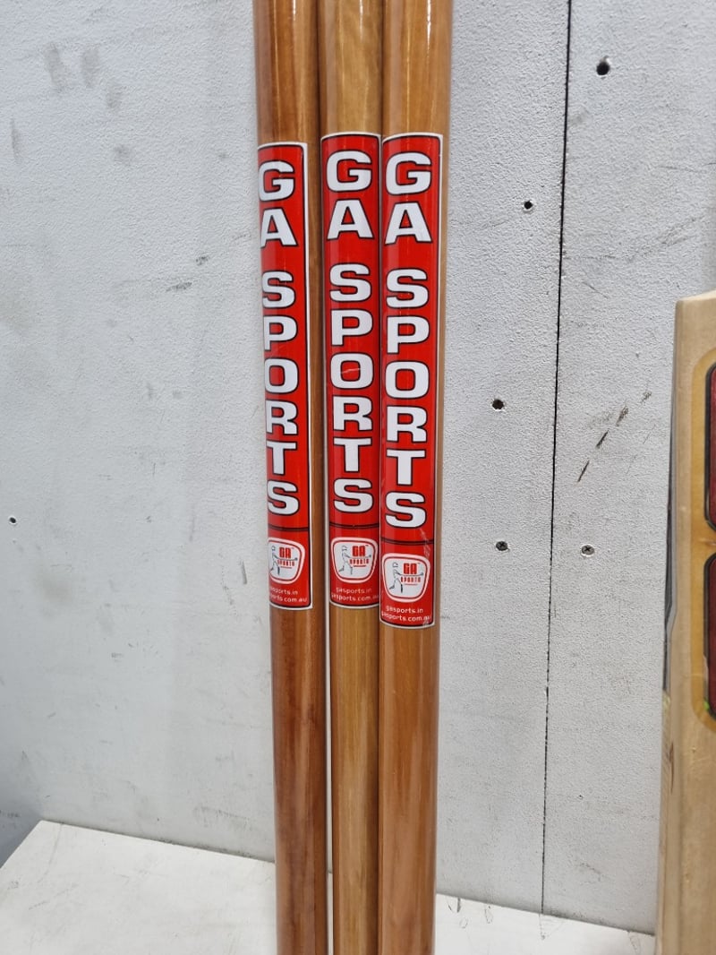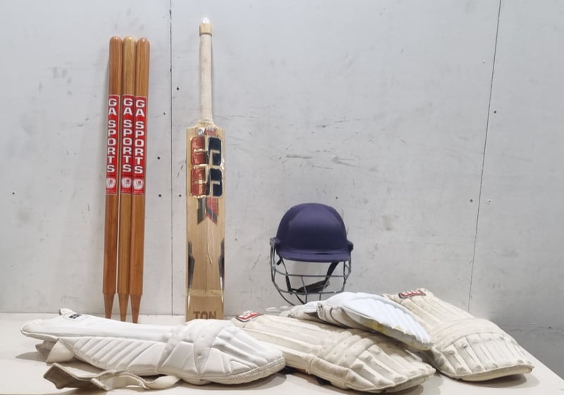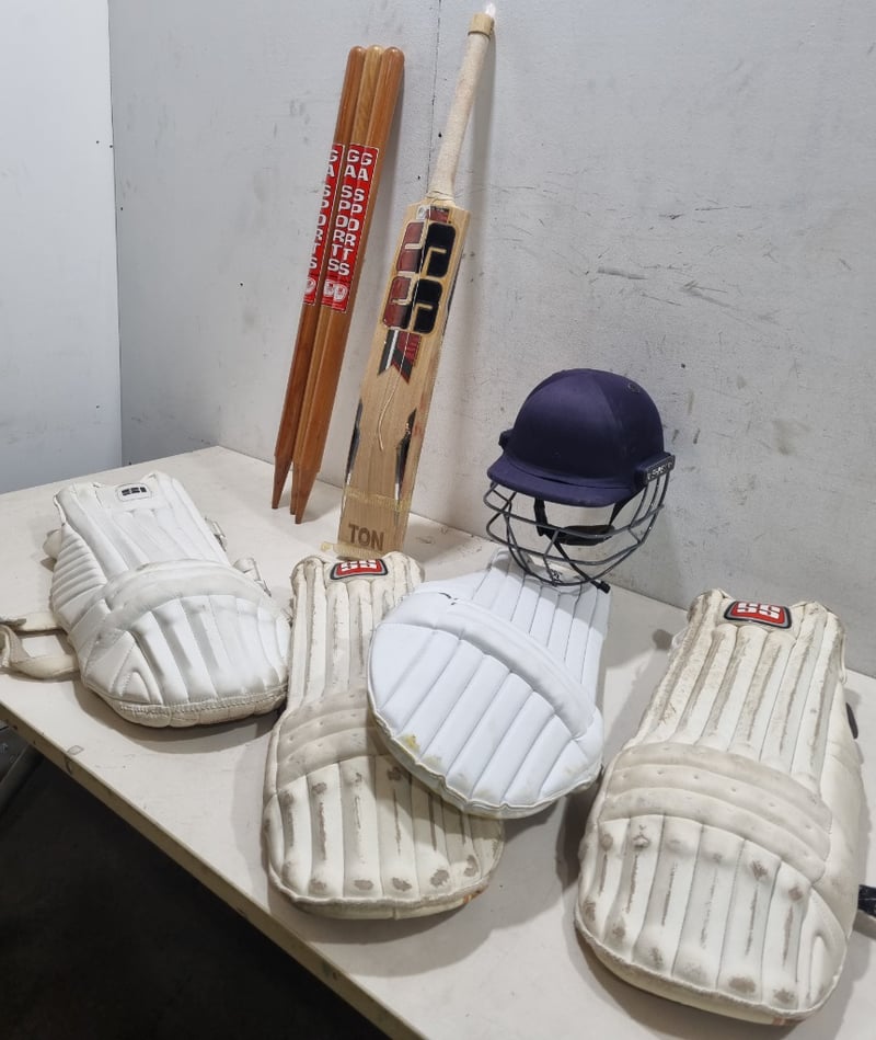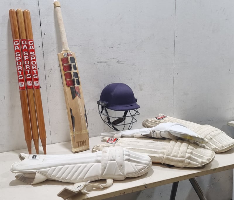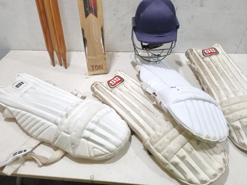 Cricket equipment collection featuring Gasports brand items. Includes three natural wood cricket bats with red and white "GASPORTS" branding, one light timber bat marked "TON" with distinctive red and black inlay design. Navy blue Shrey cricket helmet with protective grille and ventilation ports. Collection comprises five pairs of white padded cricket pads/leg guards with varied batting plate designs - mix of pure white and cream-colored protective wear with quilted padding and velcro fastening systems. Sold as lot Note: signs of wear and tear