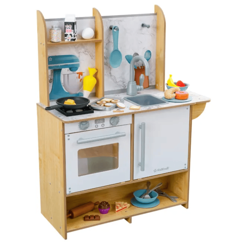 RRP $164 Surprise Sweets Play Kitchen Baking with a surprise! The KidKraft Surprise Sweets Play Kitchen is a sturdy wood kitchen designed for baking up and decorating treats with magical water-reveal techniques. The modern aesthetic of this mostly white wooden play kitchen is the perfect backdrop for displaying pastries that come alive with a little water. Simply wet the sponge on the piping bag with water and ""decorate"" the sweets to watch icing and sprinkles magically appear. A 32-piece full assortment of play food ingredients, dishes and utensils are included to complete the baking to serving experience. Kids can use the sink with faucet, burner, refrigerator and oven with click-and-turn knobs to cook up hours of role-playing fun. Handles on the oven and refrigerator are easy to grasp for little hands. Keep everything neat and tidy with two pegs for holding the pan and spoon and two shelves for storage. An extended shelf makes a great display/serving area for all your finished creations. Boys and girls will love discovering their inner pastry chef with the KidKraft Surprise Sweets Play Kitchen. Crafted of premium, recyclable wood materials for long-lasting play, and with EZ Kraft Assembly™ for less build time and more play time 8 color-change pastry food play pieces can be magically decorated with water in the piping bag Set of 32 dishes, pan, tray, utensils and play food ingredients all geared toward baking sweet treats Sink and faucet with turnable handle for realistic play Refrigerator and oven with easy-to-grasp handles; burner with two click and turn knobs for fine motor skill development Dimensions (cm): 70.99 x 30.99 x 88.01 Materials: 70% Wood, 25% Plastic, 5% Metal Item Number: 20409 UPC: 706943206126 Pegs to hold pan and spoon; handy storage shelves above burner and below oven Counter space provides room to bake & decorate; side serving shelf