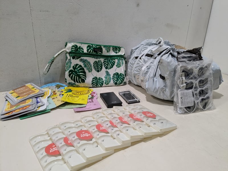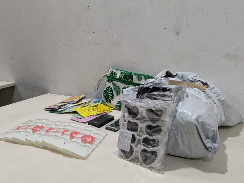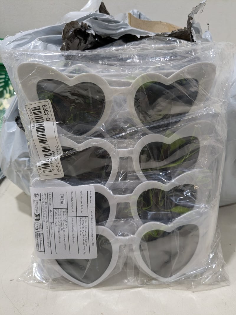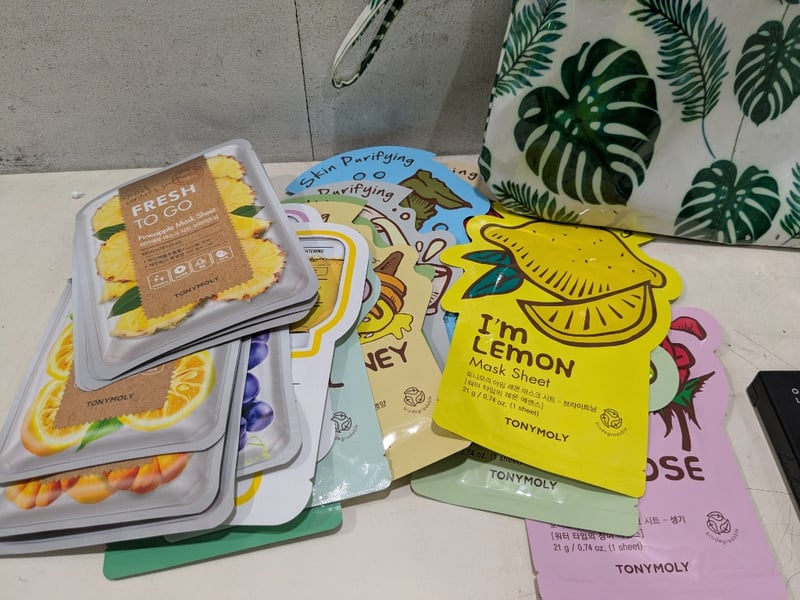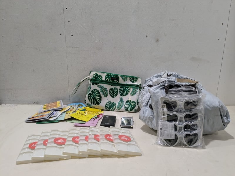 Assorted items include white heart sunglasses, various types of mask sheets, and more...Sold as a lot.