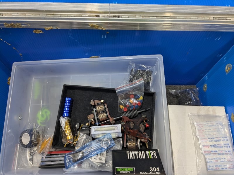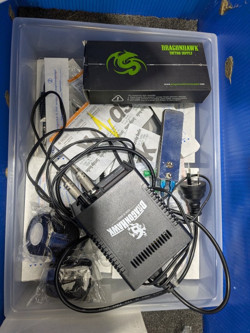 Assortment of tattoo equipment, including several Dragonhawk machines and various supplies. NOTE: Untested, signs of wear and tear.Sold as a lot.