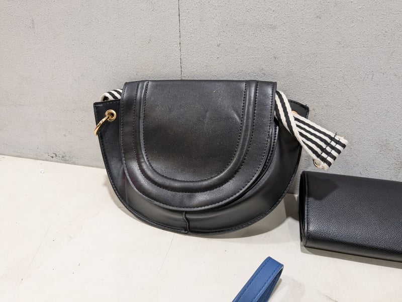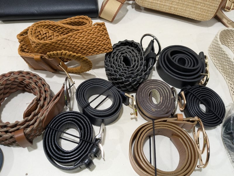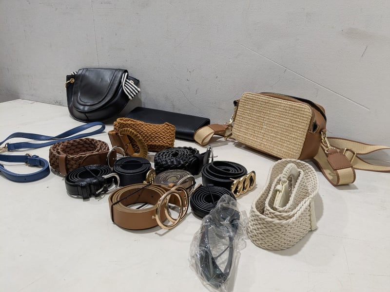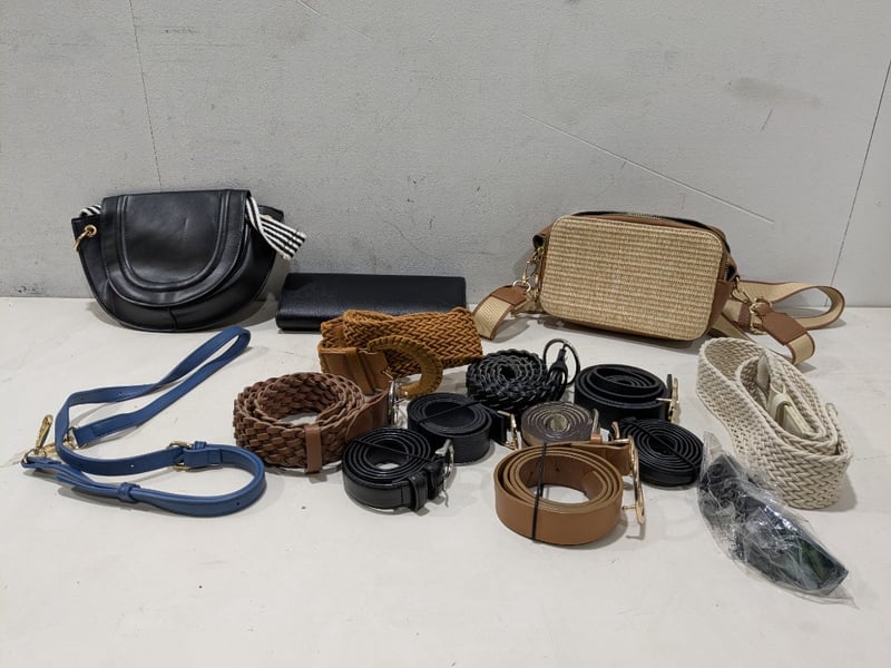 Assorted items include various types of leather-like belt, and various types of leather-like crossbody bags.NOTE: Signs of wear and tear.Sold as a lot.