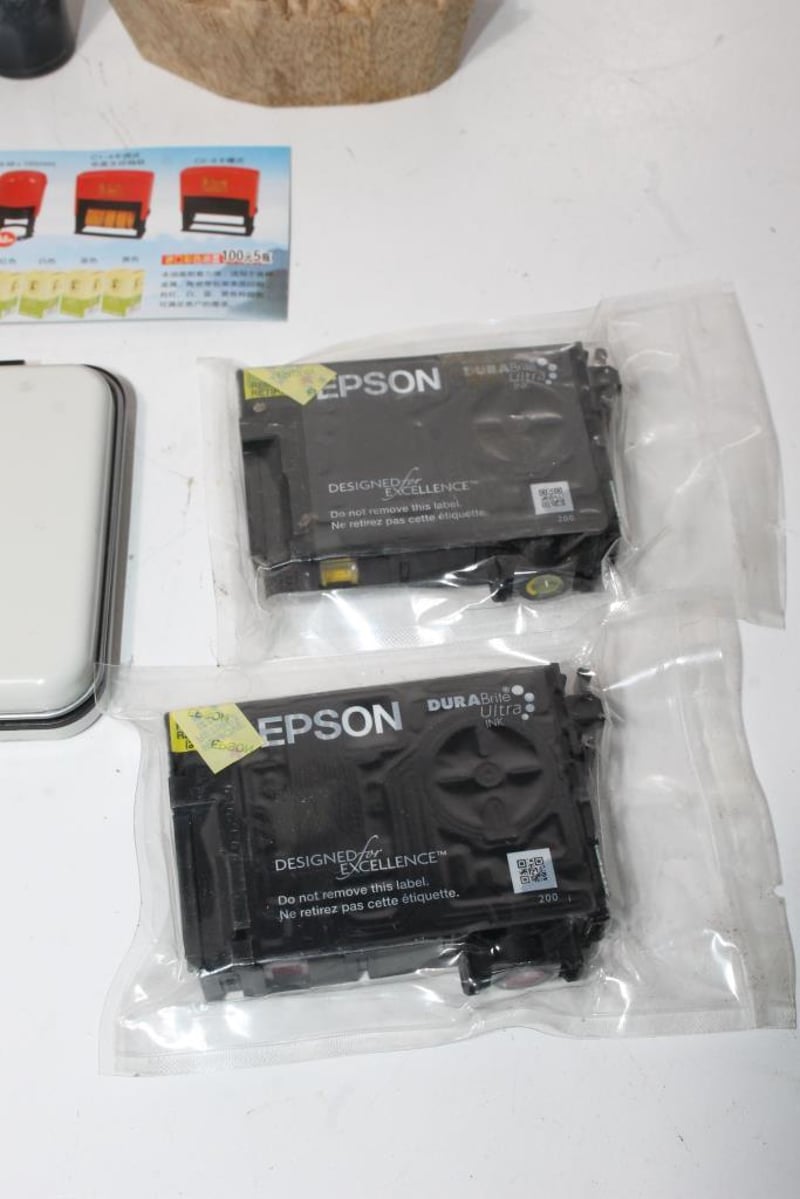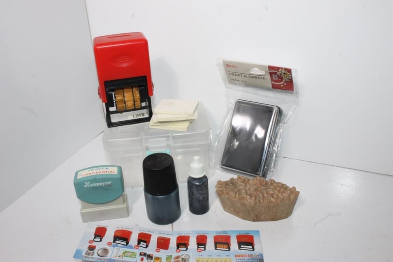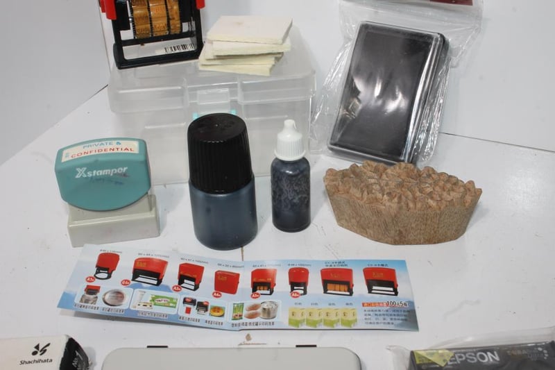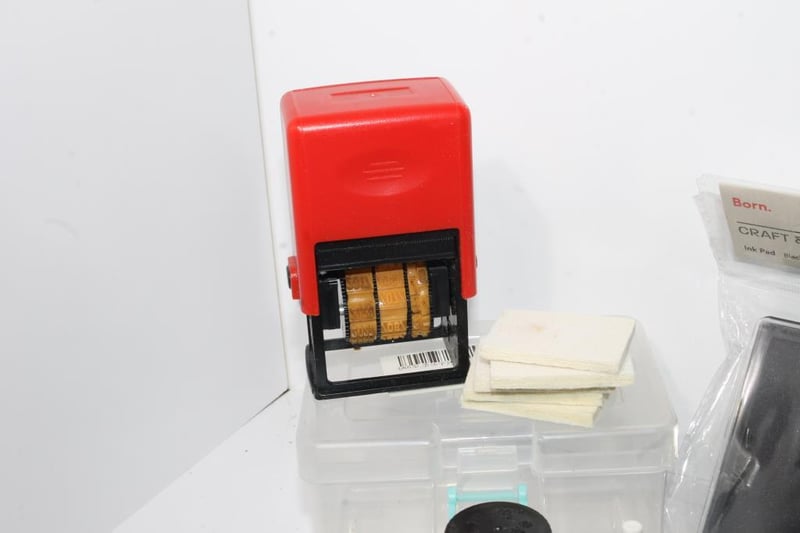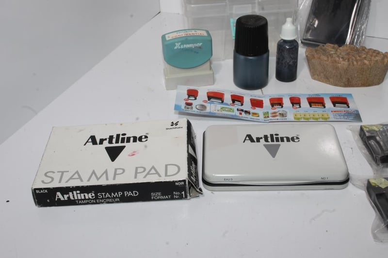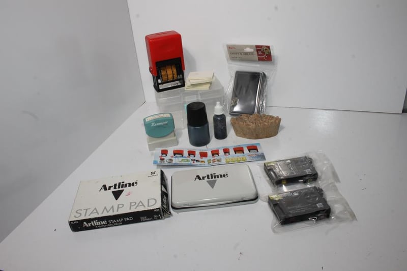 Stamping & Office Supplies Lot – Artline Pads, Stamps, Ink and AccessoriesAll untested and in varying condition – includes Artline stamp pads, Xstamper stamp, ink bottles, date stamp, craft items and two Epson ribbon cartridges.