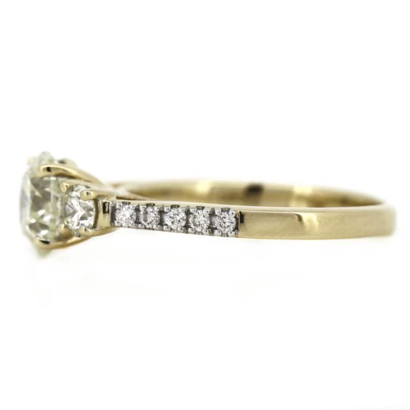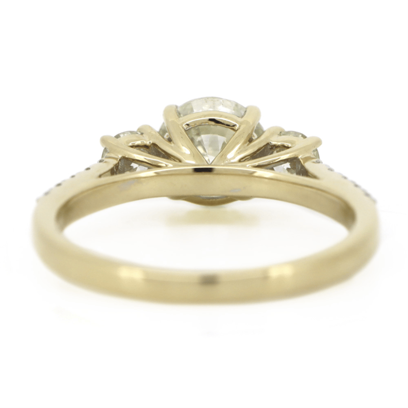 14K YELLOW GOLD AND DIAMOND, CLASSIC TRILOGY RING. The Centre Features, One Round Brilliant Cut, Diamond (1.50Ct, L-M Colour, I1 Clarity), Claw Set. Flanking The Centre Are, 2 Round Brilliant Cut, Diamonds (0.34Ct Tdw, H-I Colour, Si1-2 Clarity), Claw Set. Decorating The Band Are, 10 Round Brilliant Cut, Diamonds (0.13Ct Tdw, G-I Colour, Si-I2 Clarity), Micro-Bead Set. Ring Size O. Valuations Provided by an Independent Third-Party Professional Not Directly Associated With Lloyds Auctions at AUD $$34,500.00This valuation has been conducted by an independent third-party professional. The valuation amount is an assessment by the issuing valuer and does not reflect the auction value of the item. Any inquiries regarding the valuation should be directed to the issuing valuer (refer to contact details on the certificate), as Lloyds Auctions has no affiliation or influence over the valuation, the valuer, or the stated amount. Condition: Good - Refer Images 0646929+301