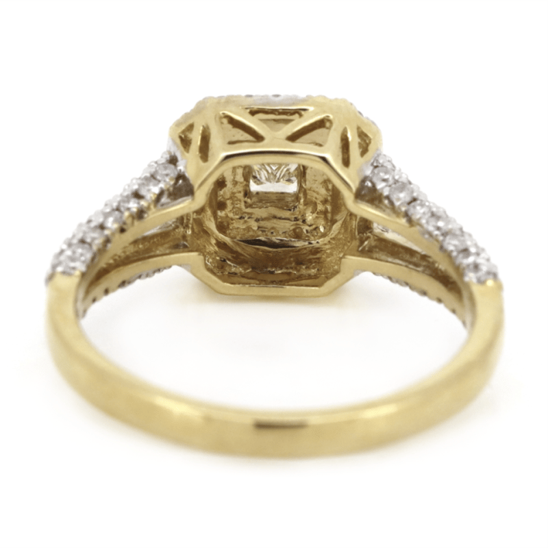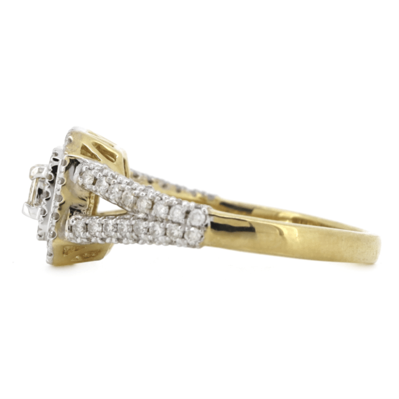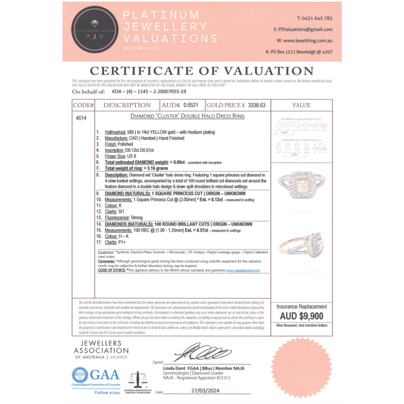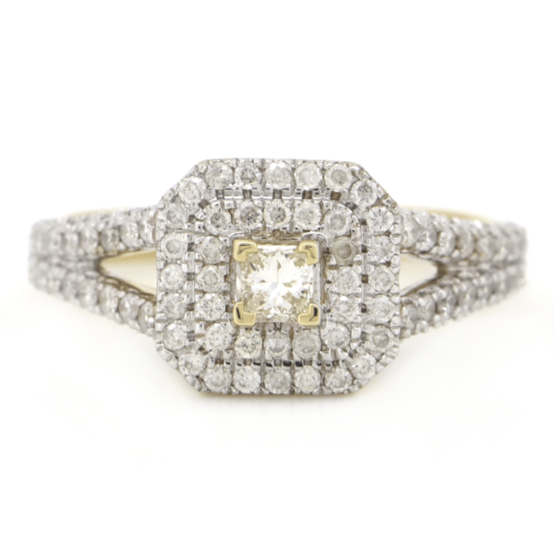 The Centre Features, One Princess Cut, Diamond (0.12Ct, K Colour, Si1 Clarity), 4 Claw Set. Surrounding The Centre In A Double Halo And Decorating The Split Band Are, 100 Round Brilliant Cut, Diamonds (0.57Ct Tdw, H-K Colour, P1+ Clarity), Claw Set. Ring Size L 1/2.