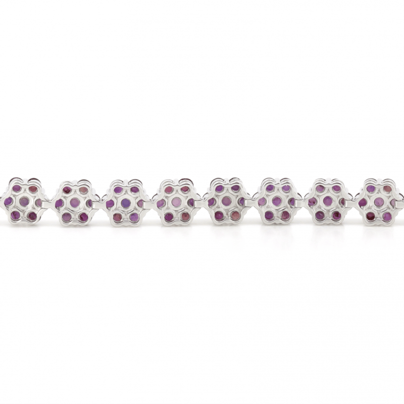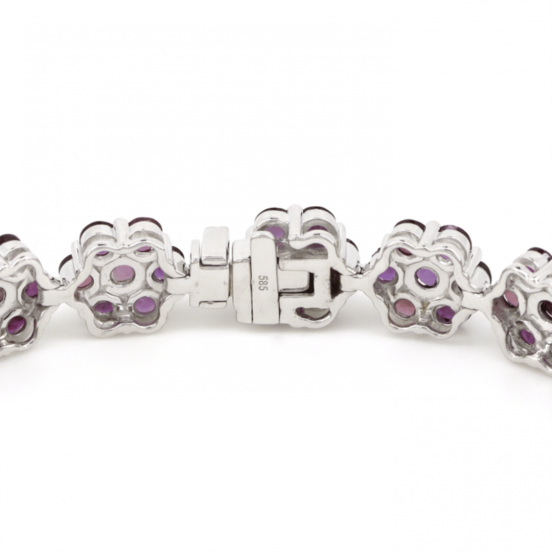 14K WHITE GOLD AND RUBY, FLORAL BRACELET.