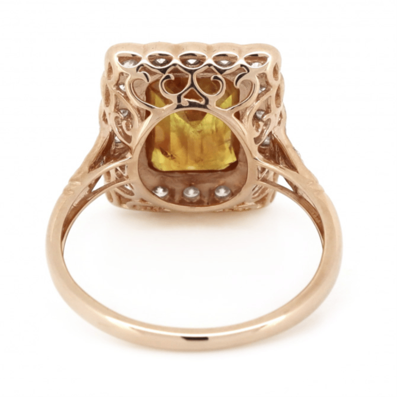 14K ROSE GOLD, ORANGE SAPPHIRE AND DIAMOND, HALO RING.