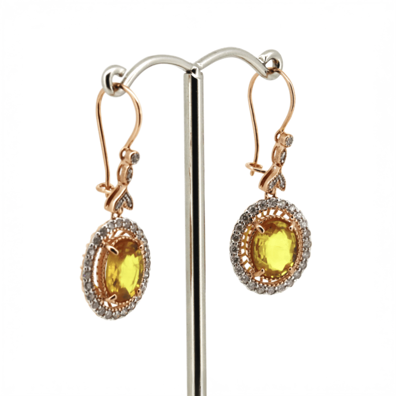14K ROSE GOLD, YELLOW SAPPHIRE AND DIAMOND, ANTIQUE INSPIRED DROP EARRINGS. The Centres Feature, 2 Oval Cut, Yellow, Sapphire (4.32Ct Tsw, Light Natural Inclusions), Claw Set. Surrounding The Centre In A Halo And Decorating The Hooks/Joins Are, 56 Round Brilliant Cut, Diamonds (0.60Ct Tdw, H-J Colour, Si-I2 Clarity), Bead Set With Millegrain Detail. The Earrings Have Shepherds Hooks, With 'C' Hook Closures. Valuations Provided by an Independent Third-Party Professional Not Directly Associated With Lloyds Auctions at AUD $$16,900.00This valuation has been conducted by an independent third-party professional. The valuation amount is an assessment by the issuing valuer and does not reflect the auction value of the item. Any inquiries regarding the valuation should be directed to the issuing valuer (refer to contact details on the certificate), as Lloyds Auctions has no affiliation or influence over the valuation, the valuer, or the stated amount. Condition: Good - Refer Images 0646929+315