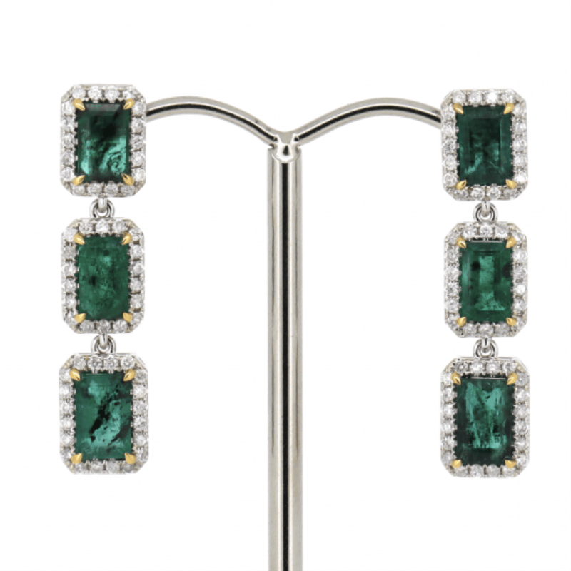 14K WHITE GOLD, EMERALD AND DIAMOND, TRIPLE DROP HALO EARRINGS. The Design Features, 6 Emerald Cut, Dark Green, Emeralds (5.55Ct Tsw, Included), 4 Claw Set. Surrounding The Centres In Halos Are, 112 Round Brilliant Cut, Diamonds (0.92Ct Tdw, I-K Colour, Si1-P2 Clarity), Claw Set. The Earrings Have Post Backs, With 14K White Gold Butterfly Clasps. Valuations Provided by an Independent Third-Party Professional Not Directly Associated With Lloyds Auctions at AUD $$16,500.00This valuation has been conducted by an independent third-party professional. The valuation amount is an assessment by the issuing valuer and does not reflect the auction value of the item. Any inquiries regarding the valuation should be directed to the issuing valuer (refer to contact details on the certificate), as Lloyds Auctions has no affiliation or influence over the valuation, the valuer, or the stated amount. Condition: Good - Refer Images 0646929+319