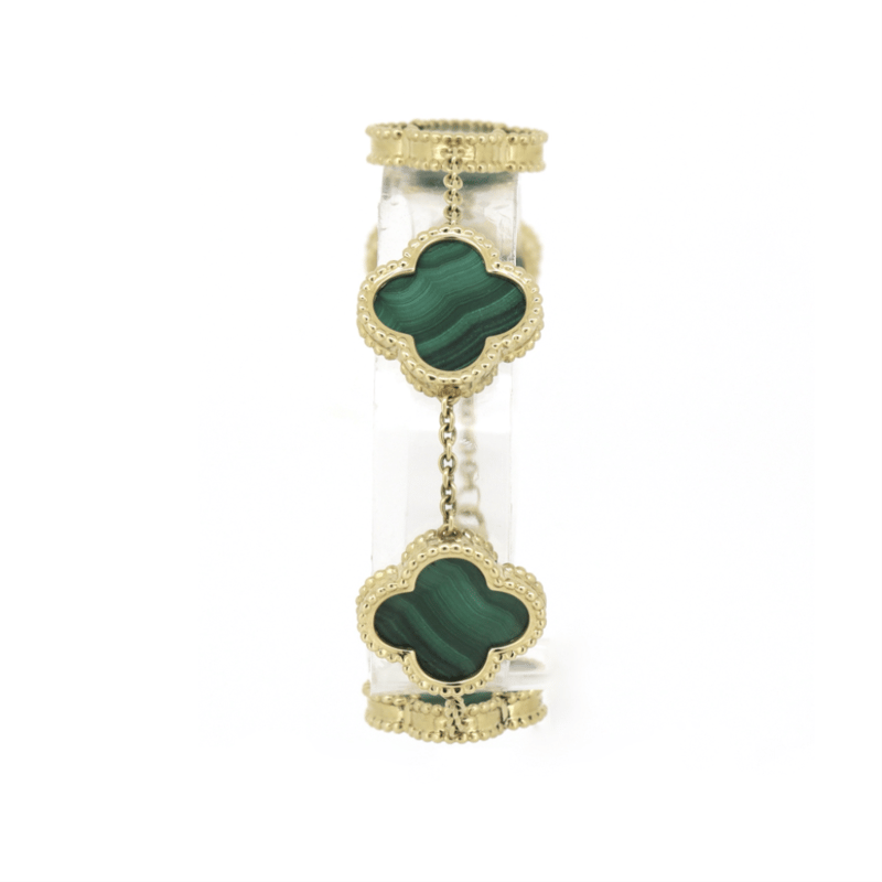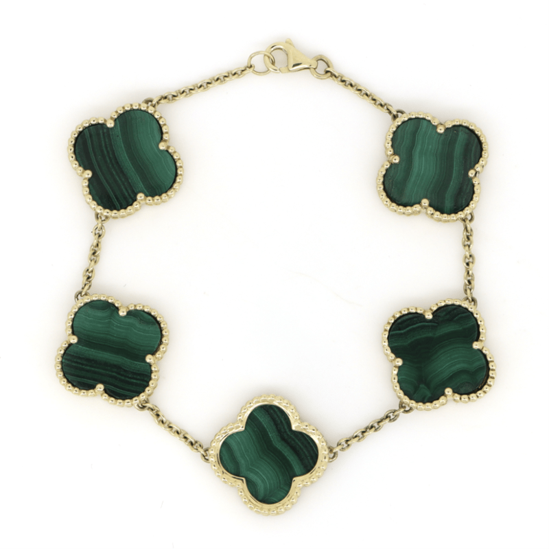 14K YELLOW GOLD, GREEN MALACHITE, BRACELET. The Design Features, 5 Four Leaf Clover Design Dark Green Charms, Lobster Clasp, Bracelet Length Is 16Cm. Condition: Good - Refer Images 0646929+320