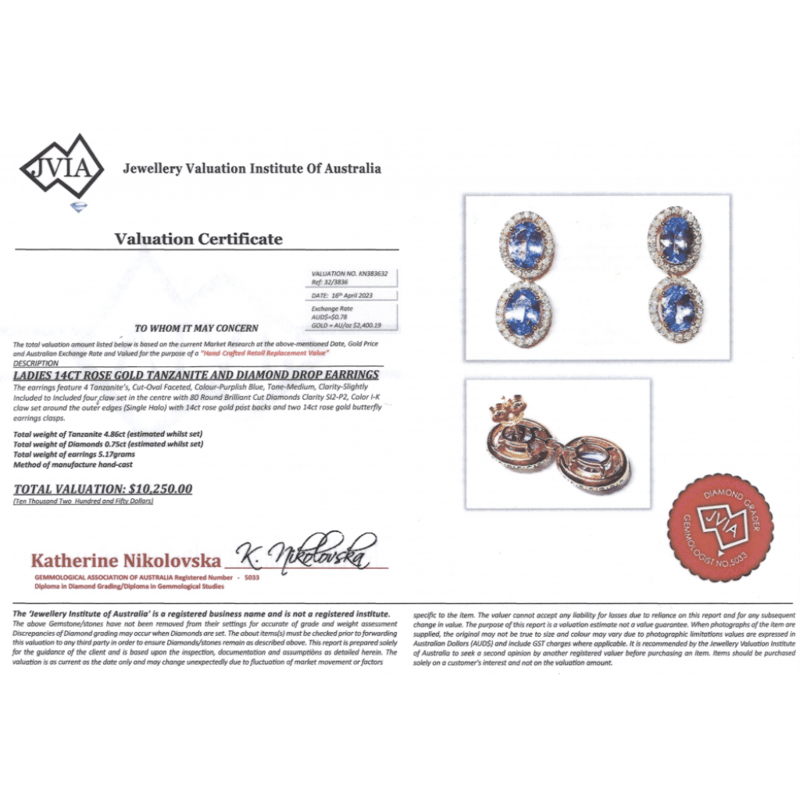 The Design Features, 4 Oval Faceted Cut, Medium Purplish-Blue, Tanzanite (4.86Ct Tsw, Slightly Included-Included), 4 Claw Set. Surrounding The Stones In Individual Halos Are, 80 Round Brilliant Cut, Diamonds (0.75Ct Tdw, I-K Colour, Si2-P2 Clarity), Claw Set. The Earrings Have Post Backs With 14K Rose Gold Butterfly Clasps.