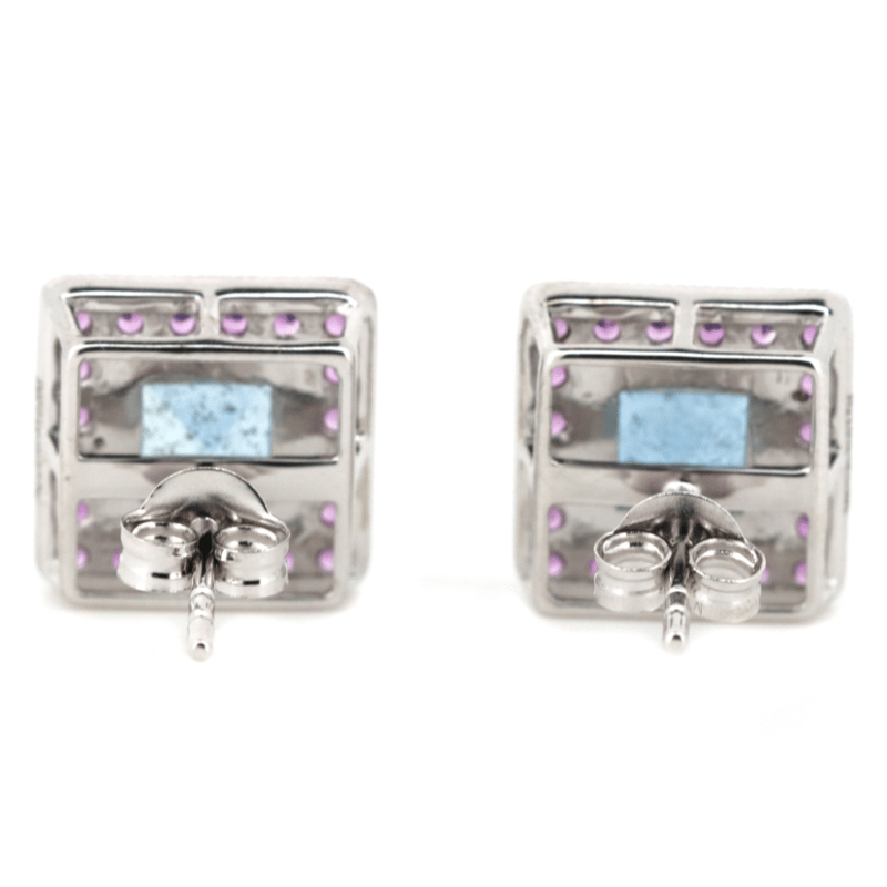 14K WHITE GOLD, AQUAMARINE AND PINK SAPPHIRE, HALO STUD EARRINGS. The Centres Feature, 2 Square Cut, Medium Blue, Aquamarines (2.01Ct Tdw, Moderate Natural Inclusions), 4 Claw Set. Encompassing The Centre In A Halo Are, 40 Round Brilliant Cut, Fancy Pink, Sapphires (0.59Ct Tsw, Eye Clean Clarity), Micro-Claw Set. The Earrings Feature, Butterfly Post Backs. Valuations Provided by an Independent Third-Party Professional Not Directly Associated With Lloyds Auctions at AUD $$13,180.00This valuation has been conducted by an independent third-party professional. The valuation amount is an assessment by the issuing valuer and does not reflect the auction value of the item. Any inquiries regarding the valuation should be directed to the issuing valuer (refer to contact details on the certificate), as Lloyds Auctions has no affiliation or influence over the valuation, the valuer, or the stated amount. Condition: Good - Refer Images 0646929+325