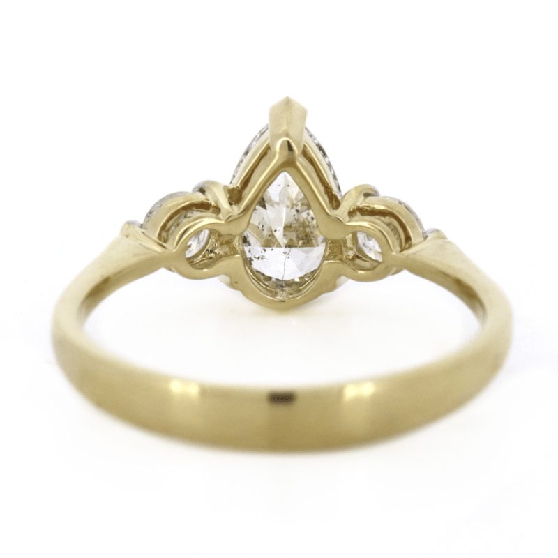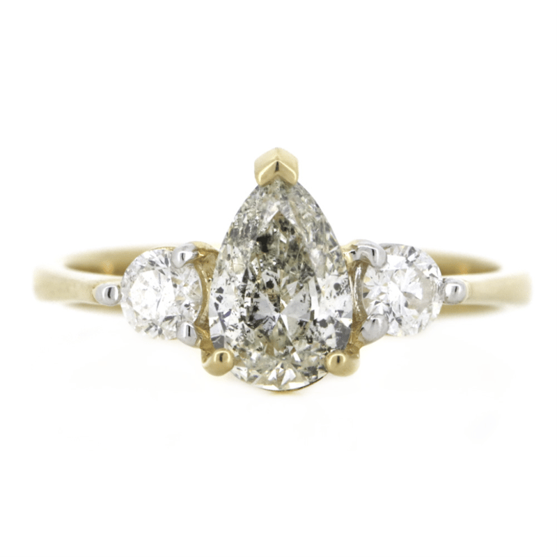 The Centre Features, One Pear Brilliant Cut, Diamond (0.77Ct, L-M Colour, I1 Clarity), Claw Set. Decorating The Shoulders Are, 2 Round Brilliant Cut, Diamonds (0.26Ct Tdw, G-H Colour, Si-I2 Clarity), Claw Set. Ring Size J.