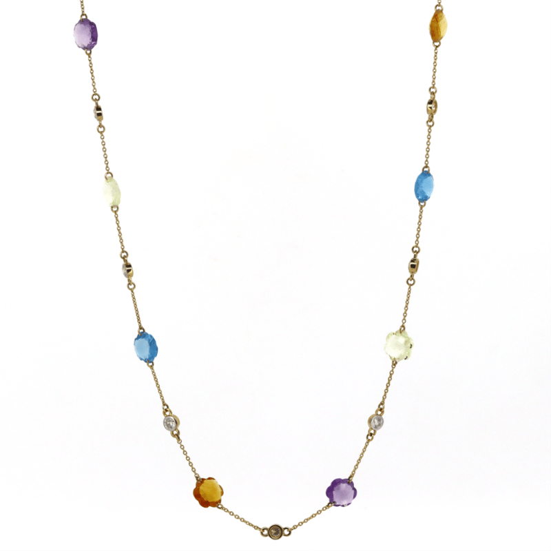 14K WHITE GOLD, MULTICOLOURED QUARTZ AND DIAMOND, NECKLACE. The Necklace Features, 12 Custom Flower Checkerboard Cut, Yellow, Orange, Purple And Blue Quartz (14.22Ct Tsw, Eye Clean), Bezel Set. Decorating The Chain Are, 13 Round Brilliant Cut, Diamonds (1.02Ct Tdw, H-I Colour, Si1-2 Clarity), Set. The Necklace Features A Fine Link Cable Chain And Is 60Cm Long With A Lobster Clasp. Valuations Provided by an Independent Third-Party Professional Not Directly Associated With Lloyds Auctions at AUD $$14,200.00This valuation has been conducted by an independent third-party professional. The valuation amount is an assessment by the issuing valuer and does not reflect the auction value of the item. Any inquiries regarding the valuation should be directed to the issuing valuer (refer to contact details on the certificate), as Lloyds Auctions has no affiliation or influence over the valuation, the valuer, or the stated amount. Condition: Good - Refer Images 0646929+333