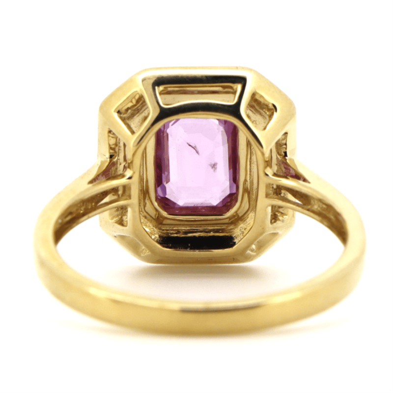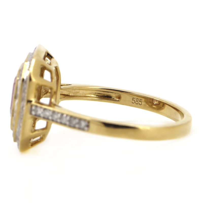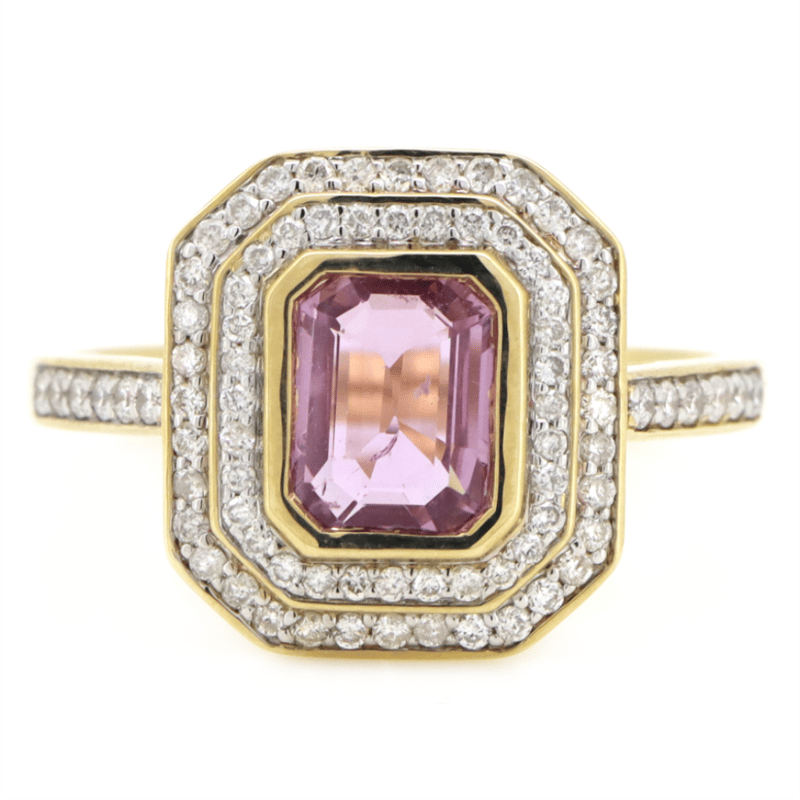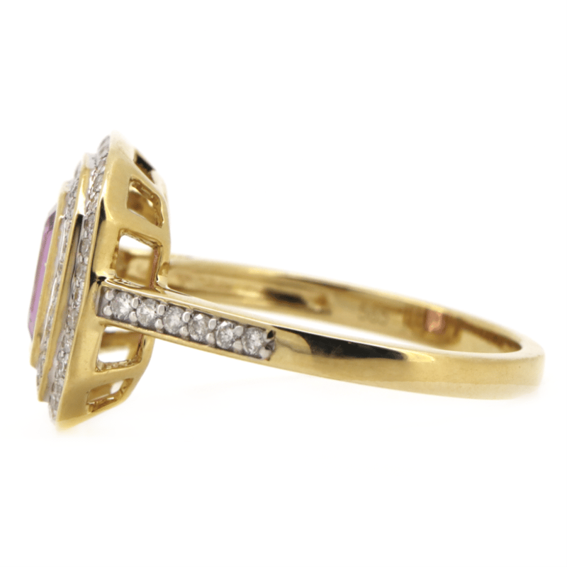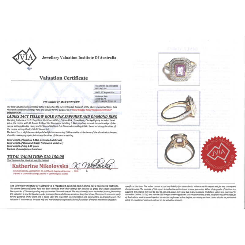 14K YELLOW GOLD, PINK SAPPHIRE AND DIAMOND, DOUBLE HALO RING. The Centre Features, One Emerald Cut, Deep Pink, Sapphire (1.12Ct Tsw, Slightly Included), Bezel Set. Surrounding The Centre In A Double Halo And Decorating The Band Are, 80 Round Brilliant Cut, Diamonds (0.40Ct Tdw, I-K Colour, Si2-P2 Clarity), Bead Set. Ring Size O 1/2. Valuations Provided by an Independent Third-Party Professional Not Directly Associated With Lloyds Auctions at AUD $$10,150.00This valuation has been conducted by an independent third-party professional. The valuation amount is an assessment by the issuing valuer and does not reflect the auction value of the item. Any inquiries regarding the valuation should be directed to the issuing valuer (refer to contact details on the certificate), as Lloyds Auctions has no affiliation or influence over the valuation, the valuer, or the stated amount. Condition: Good - Refer Images 0646929+334