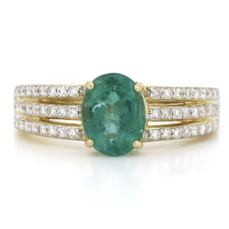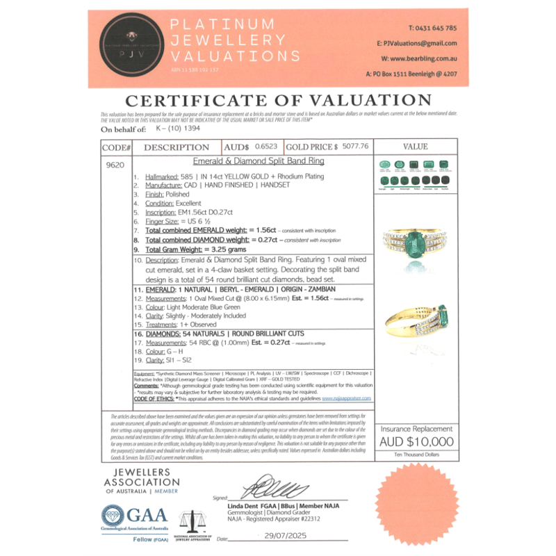 14K YELLOW GOLD, 1.56CT ZAMBIAN EMERALD AND DIAMOND, SPLIT BAND RING. The Centre Features, One Oval Cut, Zambian Emerald (1.56Ct, Moderate Inclusions), 4 Claw Set. Decorating The Split Band Design Are, 54 Round Brilliant Cut, Diamonds (0.27Ct Tdw, G-H Colour, Si1-Si2 Clarity), Bead Set. Ring Size M 1/2. Valuations Provided by an Independent Third-Party Professional Not Directly Associated With Lloyds Auctions at AUD $$10,000.00This valuation has been conducted by an independent third-party professional. The valuation amount is an assessment by the issuing valuer and does not reflect the auction value of the item. Any inquiries regarding the valuation should be directed to the issuing valuer (refer to contact details on the certificate), as Lloyds Auctions has no affiliation or influence over the valuation, the valuer, or the stated amount. Condition: Good - Refer Images 0646929+340