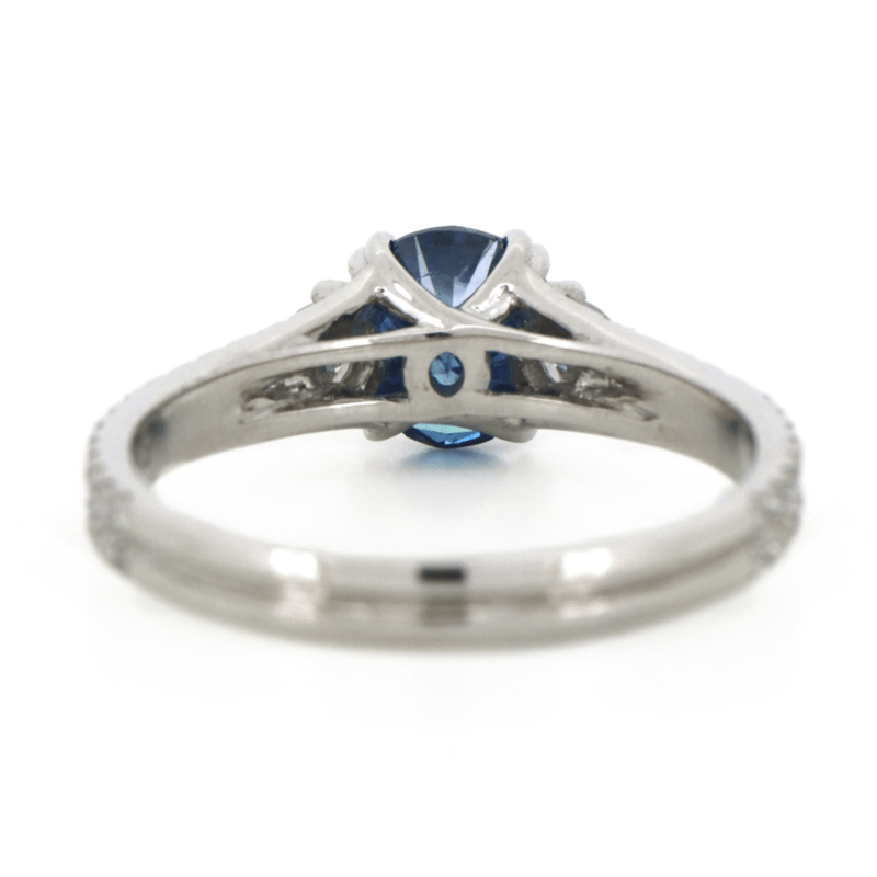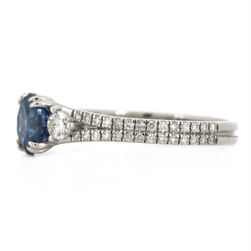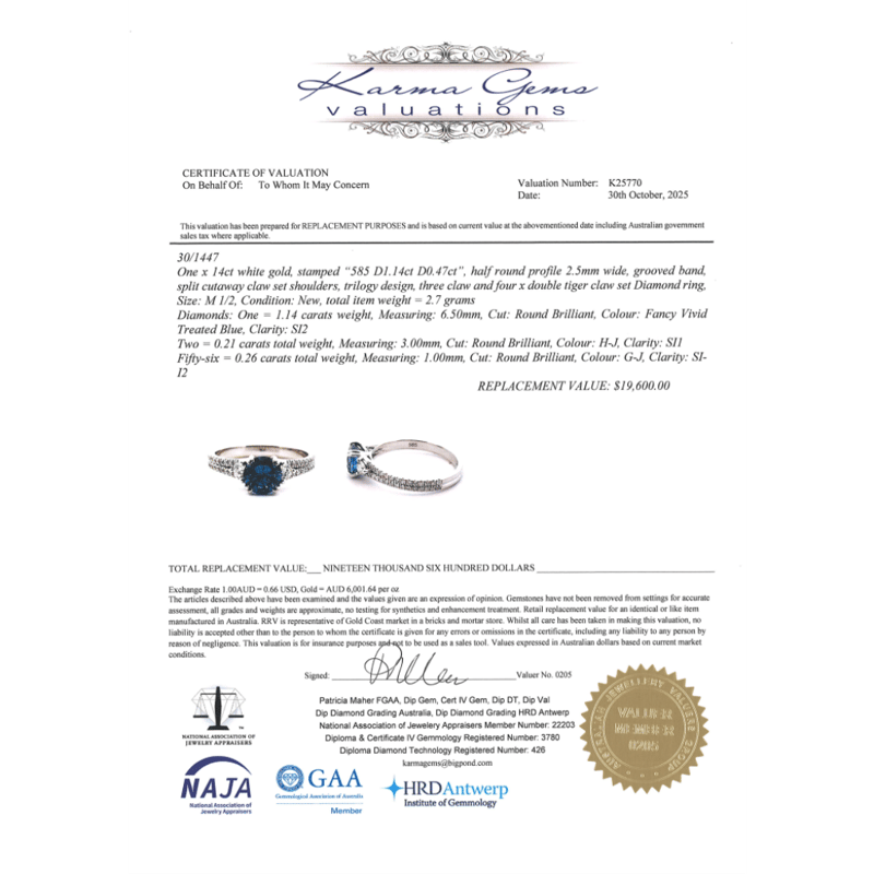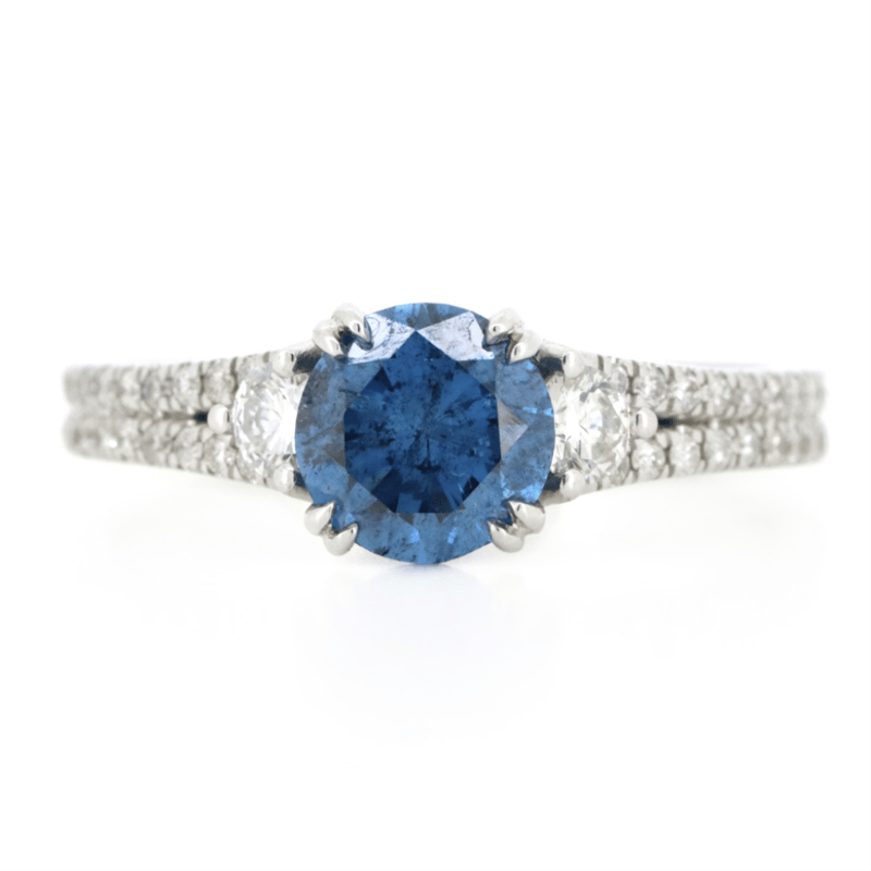 The Centre Features, One Round Brilliant Cut, Fancy Vivid Blue, Diamond (1.14Ct Tdw, Si2 Clarity), Double Tiger Claw Set. Flanking Either Side Of The Centre Are, 2 Round Brilliant Cut, Diamonds (0.21Ct Tdw, H-J Colour, Si1 Clarity), 3 Claw Set. Decorating The Double Row Band Are, 56 Round Brilliant Cut, Diamonds (0.26Ct Tdw, G-J Colour, Si-I2 Clarity), 4 Claw Set. Ring Size M 1/2.