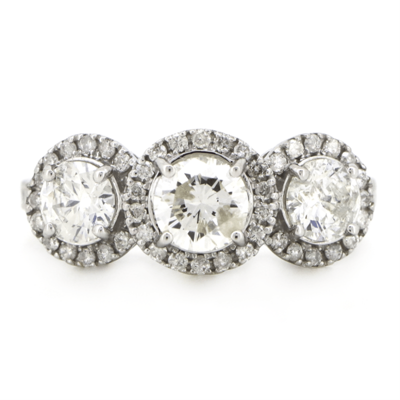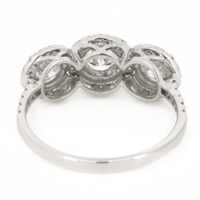 14K WHITE GOLD AND DIAMOND, HALO TRILOGY RING. The Centre Features, 3 Round Brilliant Cut, Diamonds (1.04Ct Tdw, H-K Colour, P2 Clarity), Claw Set. Surrounding The Centre In A Halo And Decorating The Band Are, 54 Round Brilliant Cut, Diamonds (0.28Ct Tdw, H-K Colour, P1+ Clarity), Micro-Bead Set. Ring Size N. Valuations Provided by an Independent Third-Party Professional Not Directly Associated With Lloyds Auctions at AUD $$9,900.00This valuation has been conducted by an independent third-party professional. The valuation amount is an assessment by the issuing valuer and does not reflect the auction value of the item. Any inquiries regarding the valuation should be directed to the issuing valuer (refer to contact details on the certificate), as Lloyds Auctions has no affiliation or influence over the valuation, the valuer, or the stated amount. Condition: Good - Refer Images 0646929+345