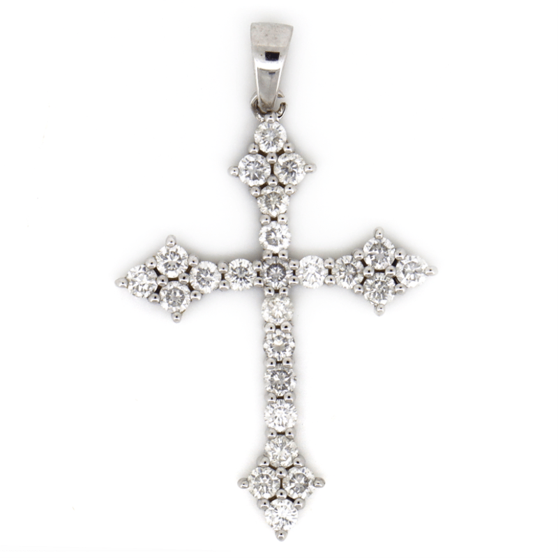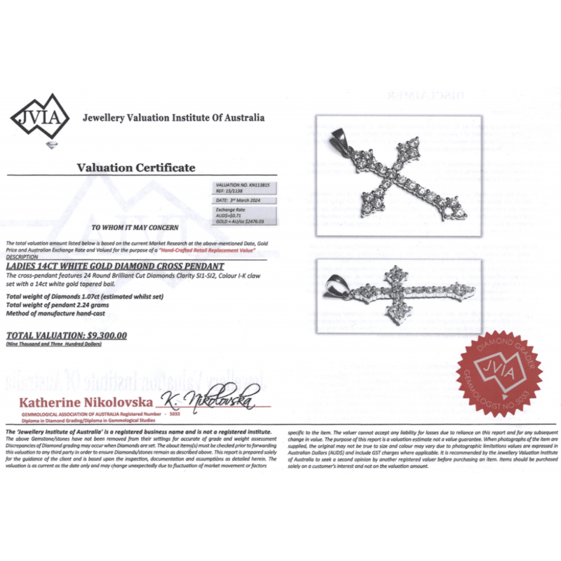 14K WHITE GOLD, 1.07CT TDW DIAMOND, CRUCIFIX PENDANT. The Design Features, 24 Round Brilliant Cut, Diamonds (1.07Ct Tdw, I-K Colour, Si1-Si2 Clarity), Claw Set. Valuations Provided by an Independent Third-Party Professional Not Directly Associated With Lloyds Auctions at AUD $$9,300.00This valuation has been conducted by an independent third-party professional. The valuation amount is an assessment by the issuing valuer and does not reflect the auction value of the item. Any inquiries regarding the valuation should be directed to the issuing valuer (refer to contact details on the certificate), as Lloyds Auctions has no affiliation or influence over the valuation, the valuer, or the stated amount. Condition: Good - Refer Images 0645943+4