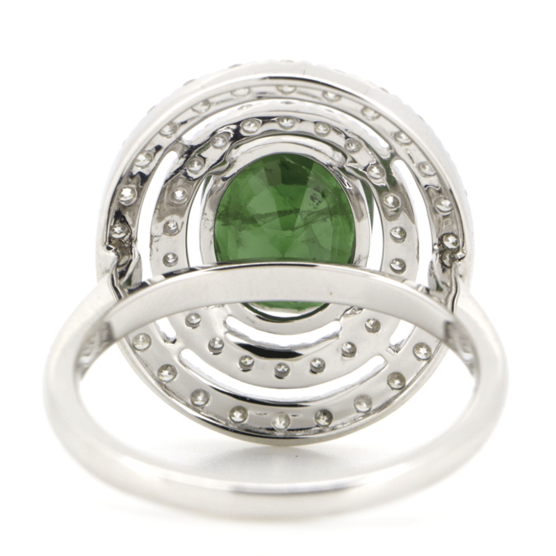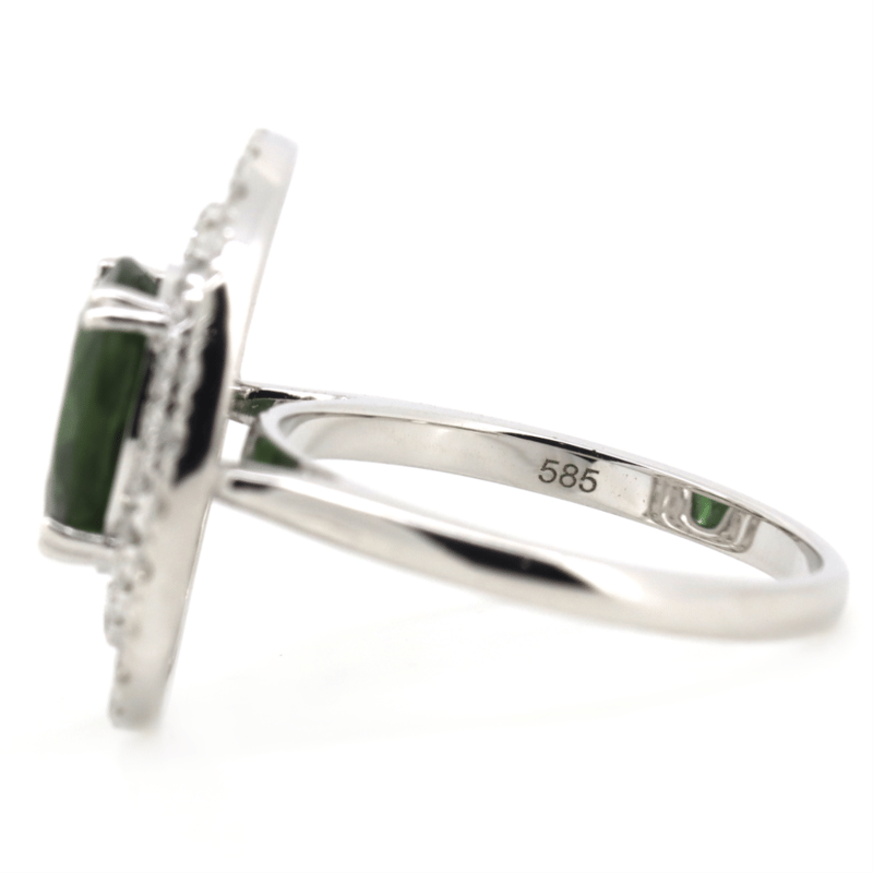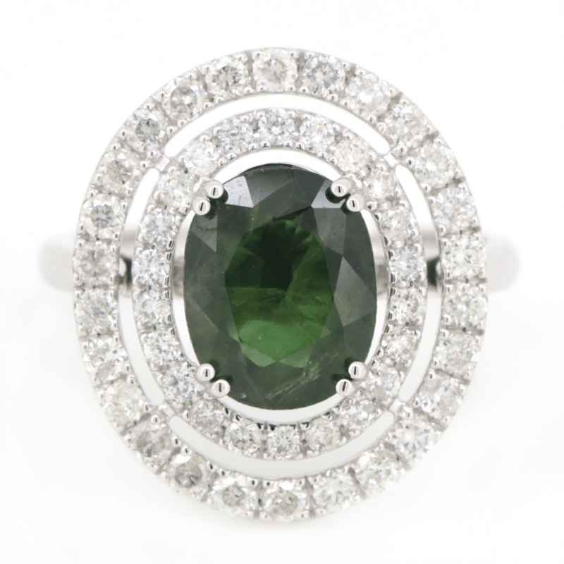 14K WHITE GOLD, GREEN SAPPHIRE AND DIAMOND, DOUBLE HALO RING.