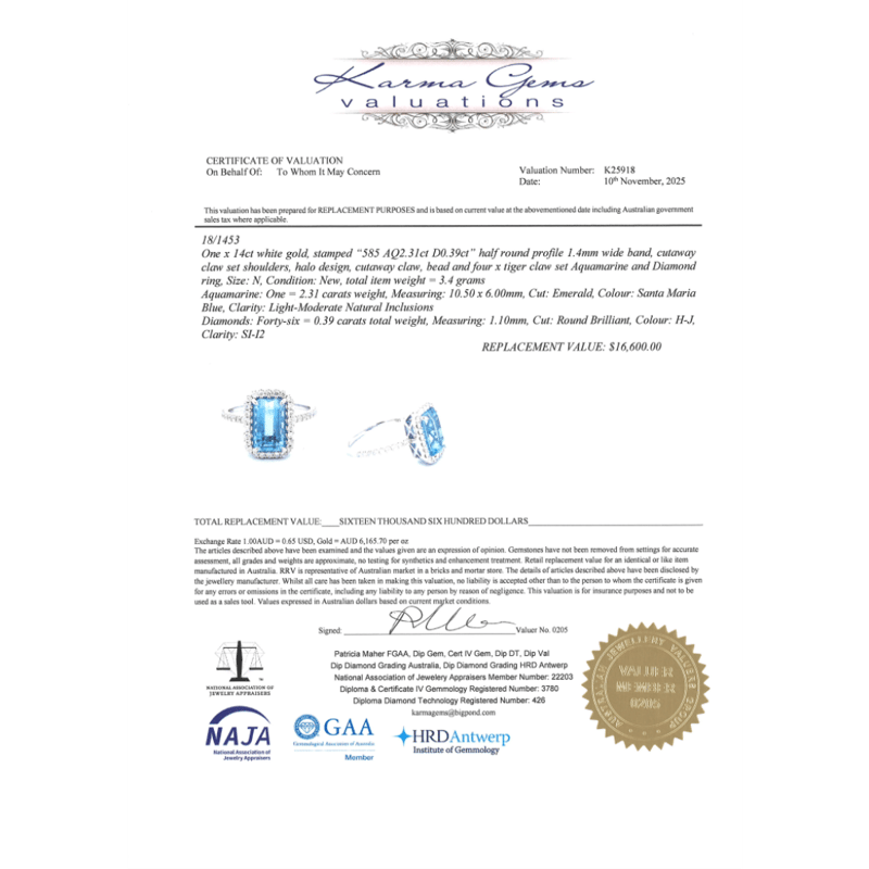 The Centre Features, One Emerald Cut, Greyish-Blue, Aquamarine (2.31Ct, Light Moderate Inclusions), 4 Claw Set. Surrounding The Centre In A Halo And Decorating The Band Are, 46 Round Brilliant Cut, Diamonds (0.39Ct Tdw, H-J Colour, Si-I2 Clarity), Micro-Claw Set. Ring Size N.
