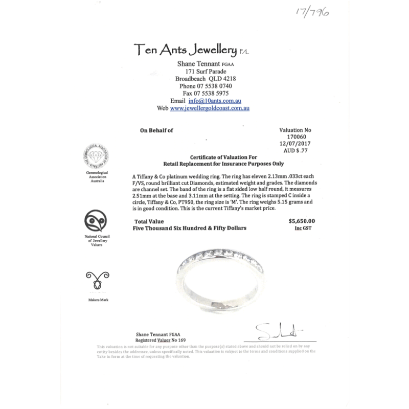 PT 950 AND DIAMOND, TIFFANY & CO BAND RING. The Ring Features, 11 Round Brilliant Cut, Diamonds (0.36Ct Tdw, F Colour, Vs Clarity), Channel Set. Ring Size M. Condition: Pre-Owned. Valuations Provided by an Independent Third-Party Professional Not Directly Associated With Lloyds Auctions at AUD $$5,650.00This valuation has been conducted by an independent third-party professional. The valuation amount is an assessment by the issuing valuer and does not reflect the auction value of the item. Any inquiries regarding the valuation should be directed to the issuing valuer (refer to contact details on the certificate), as Lloyds Auctions has no affiliation or influence over the valuation, the valuer, or the stated amount. Condition: Good - Refer Images 0645943+35