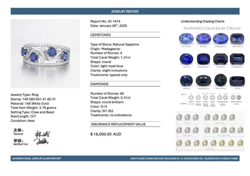 14CT WHITE GOLD MADAGASCAN SAPPHIRE AND DIAMOND DRESS RING Featuring Centre, 4 Round Cut, Light Royal Blue Madagascan Sapphires (1.41Ct Tsw, Slight Inclusions), Claw Set, With 60 Round Brilliant Cut Diamonds (0.31Ct Tdw, G-H Colour, Si1-Si2 Clarity) Bead Set. Ring Size O. Valuations Provided by an Independent Third-Party Professional Not Directly Associated With Lloyds Auctions at AUD $18000This valuation has been conducted by an independent third-party professional. The valuation amount is an assessment by the issuing valuer and does not reflect the auction value of the item. Any inquiries regarding the valuation should be directed to the issuing valuer (refer to contact details on the certificate), as Lloyds Auctions has no affiliation or influence over the valuation, the valuer, or the stated amount. Condition: Good - Refer Images 0587859+1899