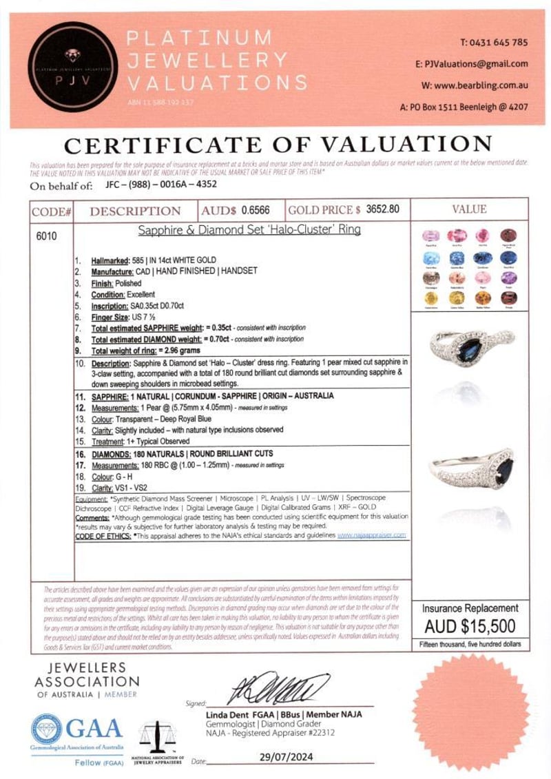 14CT WHITE GOLD AUSTRALIAN SAPPHIRE AND DIAMOND DRESS RING Featuring Centre, One Pear Cut, Deep Royal Blue Australian Sapphire (0.35Ct, Slightly Included), Bead Set, With 180 Round Brilliant Cut Diamonds (0.70Ct Tdw, G-H Colour, Vs1-Vs2 Clarity), Microbead Set. Ring Size O. Valuations Provided by an Independent Third-Party Professional Not Directly Associated With Lloyds Auctions at AUD $15500This valuation has been conducted by an independent third-party professional. The valuation amount is an assessment by the issuing valuer and does not reflect the auction value of the item. Any inquiries regarding the valuation should be directed to the issuing valuer (refer to contact details on the certificate), as Lloyds Auctions has no affiliation or influence over the valuation, the valuer, or the stated amount. Condition: Good - Refer Images 0587859+1912