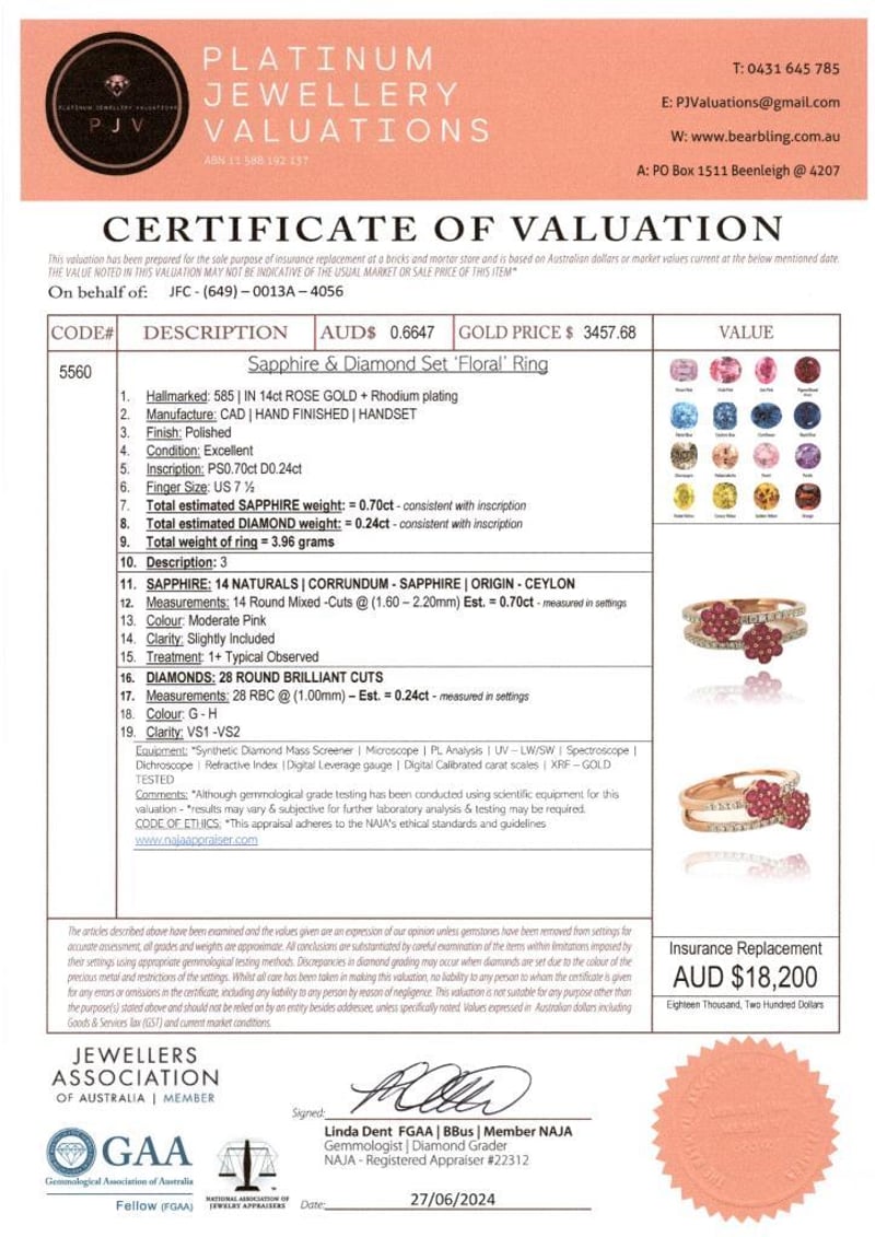 14CT ROSE GOLD PINK CEYLON SAPPHIRE AND DIAMOND CLUSTER RING Featuring, 14 Round Cut, Moderate Pink Ceylon Sapphires (0.70Ct Tsw, Slightly Included), Claw Set, With 28 Round Brilliant Cut Diamonds (0.24Ct Tdw, G-H Colour, Vs1-Vs2 Clarity), Bead Set. Ring Size O. Valuations Provided by an Independent Third-Party Professional Not Directly Associated With Lloyds Auctions at AUD $18200This valuation has been conducted by an independent third-party professional. The valuation amount is an assessment by the issuing valuer and does not reflect the auction value of the item. Any inquiries regarding the valuation should be directed to the issuing valuer (refer to contact details on the certificate), as Lloyds Auctions has no affiliation or influence over the valuation, the valuer, or the stated amount. Condition: Good - Refer Images 0587859+1898