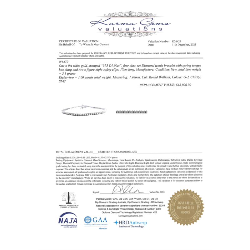 9K WHITE GOLD AND 1.00CT TDW DIAMOND, TENNIS BRACELET. The Design Features, 82 Round Brilliant Cut, Diamonds (1.00Ct Tdw, G-J Colour, Si-I2 Clarity), 4 Claw Set In A Single Row. The Bracelet Has A Box Clasp With 2 Figure Eight Safety Clips. Bracelet Length Is 17Cm. Valuations Provided by an Independent Third-Party Professional Not Directly Associated With Lloyds Auctions at AUD $$18,000.00This valuation has been conducted by an independent third-party professional. The valuation amount is an assessment by the issuing valuer and does not reflect the auction value of the item. Any inquiries regarding the valuation should be directed to the issuing valuer (refer to contact details on the certificate), as Lloyds Auctions has no affiliation or influence over the valuation, the valuer, or the stated amount. Condition: Good - Refer Images 0645947+4