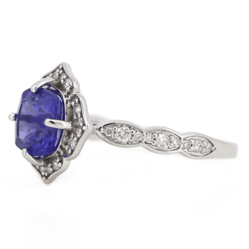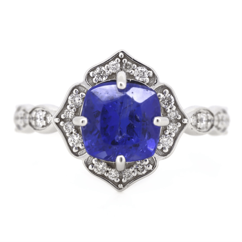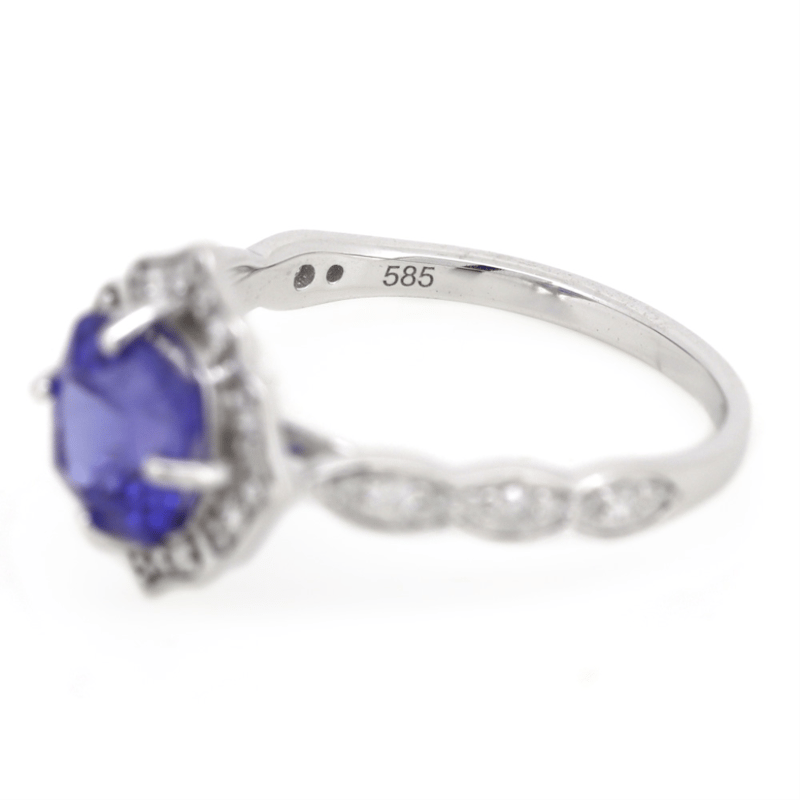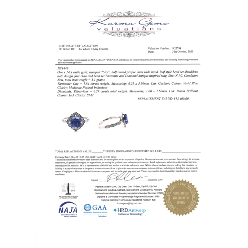 14K WHITE GOLD, TANZANITE AND DIAMOND, HALO RING. The Centre Features, One Cushion Cut, Vivid Blue, Tanzanite (1.84Ct, Moderately Included), 4 Claw Set. Surrounding The Centre Are, 34 Round Brilliant Cut, Diamonds (0.29Ct Tdw, H-J Colour, Si-I2 Clarity), Bead Set. Ring Size N 1/2. Valuations Provided by an Independent Third-Party Professional Not Directly Associated With Lloyds Auctions at AUD $$13,400.00This valuation has been conducted by an independent third-party professional. The valuation amount is an assessment by the issuing valuer and does not reflect the auction value of the item. Any inquiries regarding the valuation should be directed to the issuing valuer (refer to contact details on the certificate), as Lloyds Auctions has no affiliation or influence over the valuation, the valuer, or the stated amount. Condition: Good - Refer Images 0645947+22