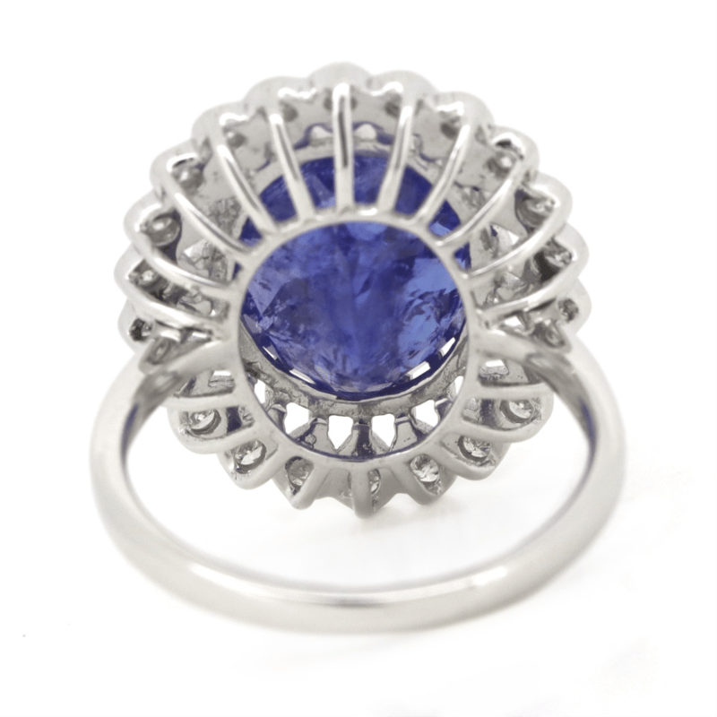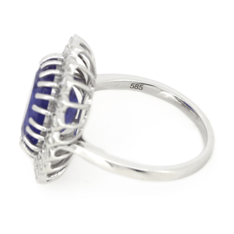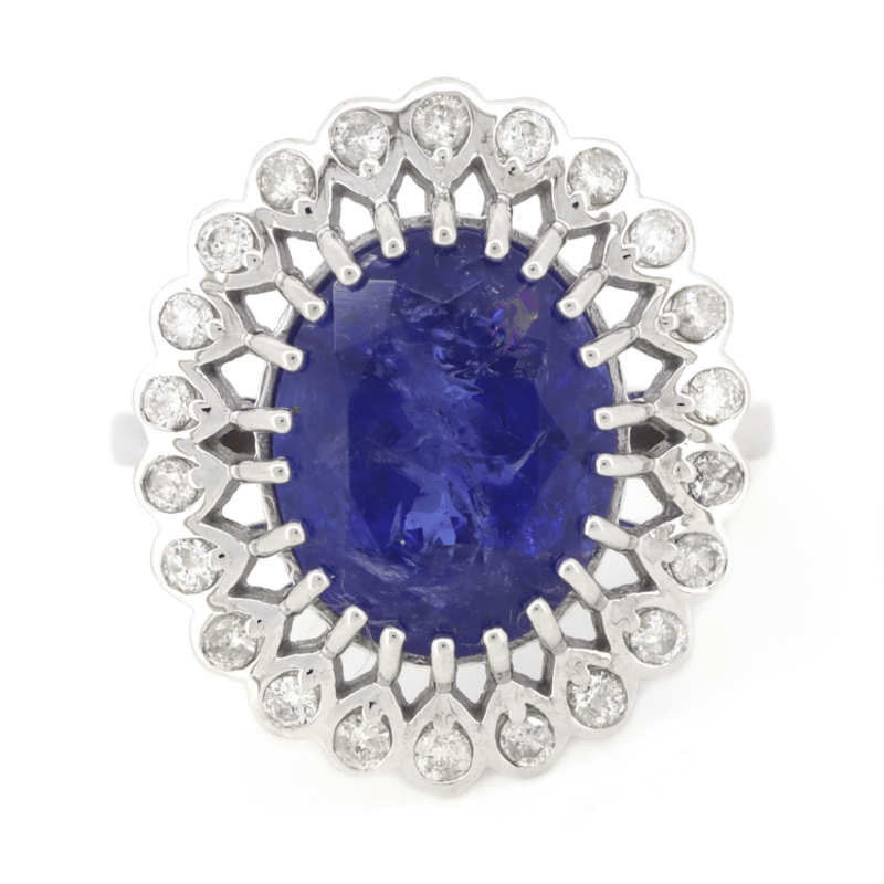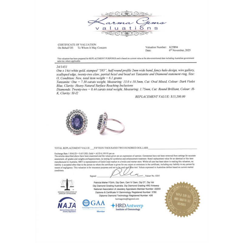 14K WHITE GOLD, TANZANITE AND DIAMOND, ANTIQUE INSPIRED HALO RING. The Centre Feature, One Oval Faceted Cut, Deep Violetish-Blue, Tanzanite (7.30Ct, Included), Multi-Claw Set. Surrounding The Centre In A Halo Are, 22 Round Brilliant Cut, Diamonds (0.44Ct Tdw, H-K Colour, Si-I Clarity), Bead/Bezel Set. Ring Size O. Valuations Provided by an Independent Third-Party Professional Not Directly Associated With Lloyds Auctions at AUD $$15,200.00This valuation has been conducted by an independent third-party professional. The valuation amount is an assessment by the issuing valuer and does not reflect the auction value of the item. Any inquiries regarding the valuation should be directed to the issuing valuer (refer to contact details on the certificate), as Lloyds Auctions has no affiliation or influence over the valuation, the valuer, or the stated amount. Condition: Good - Refer Images 0645947+25