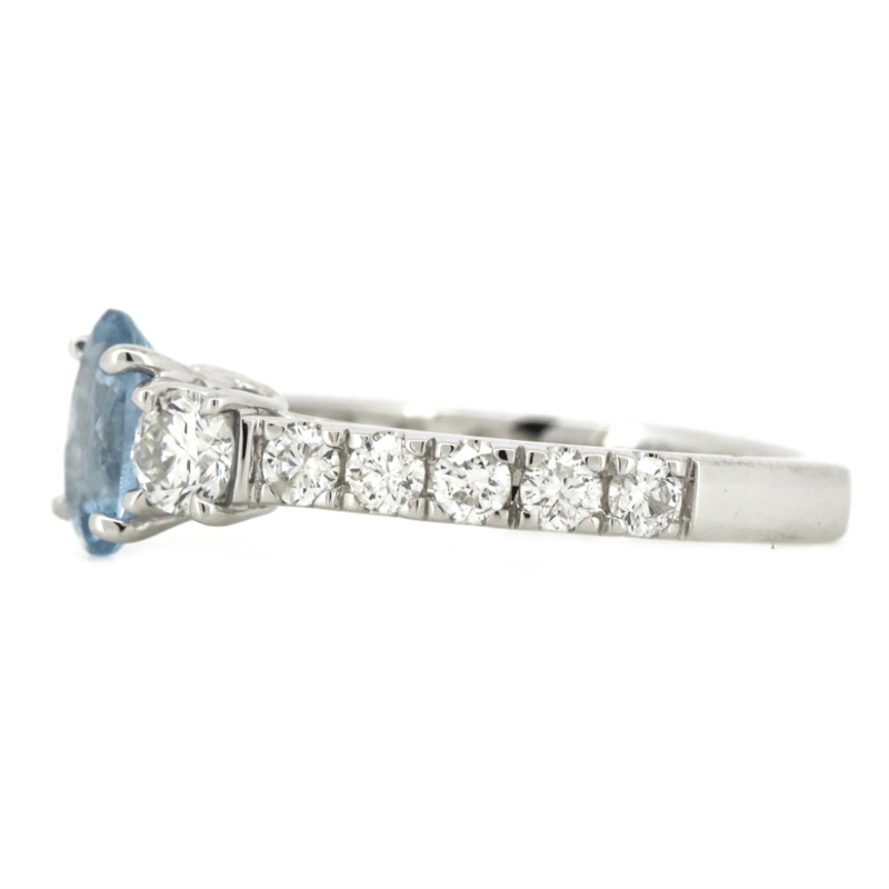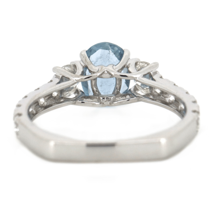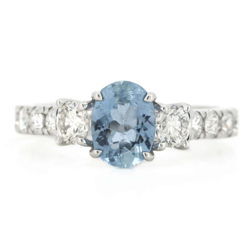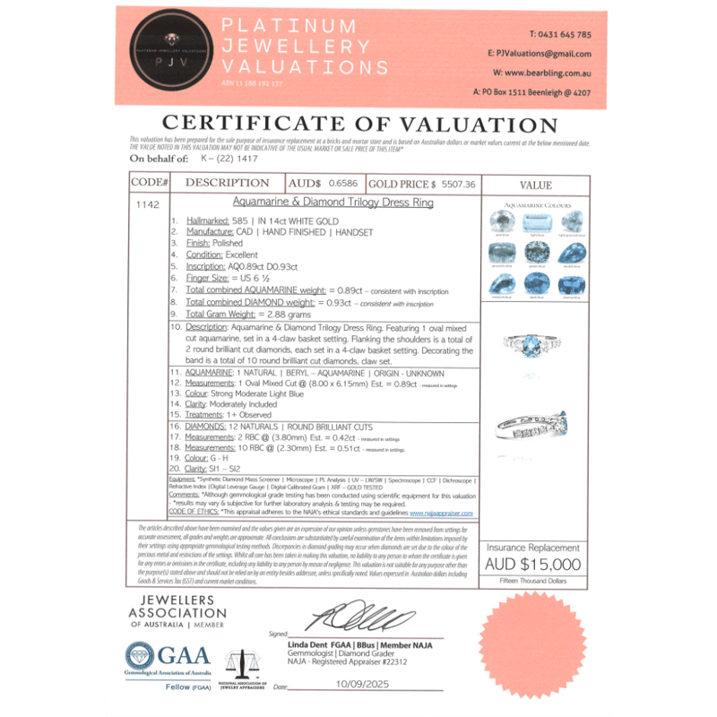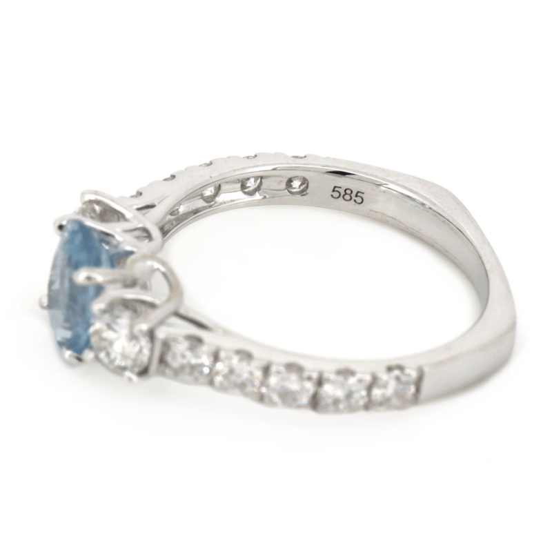 14K WHITE GOLD, AQUAMARINE AND DIAMOND, DRESS RING. The Centre Features, One Oval Cut, Aquamarine (0.89Ct, Strong Light Blue), Claw Set. Decorating The Shoulders Are, 2 Round Brilliant Cut, Diamonds (0.42Ct Tdw, G-H Colour, Si1-Si2 Clarity). Embellishing The Band Are, 10 Round Brilliant Cut, Diamonds (0.51Ct Tdw, G-H Colour, Si1-Si2 Clarity), Claw Set. Ring Size M 1/2. Valuations Provided by an Independent Third-Party Professional Not Directly Associated With Lloyds Auctions at AUD $$15,000.00This valuation has been conducted by an independent third-party professional. The valuation amount is an assessment by the issuing valuer and does not reflect the auction value of the item. Any inquiries regarding the valuation should be directed to the issuing valuer (refer to contact details on the certificate), as Lloyds Auctions has no affiliation or influence over the valuation, the valuer, or the stated amount. Condition: Good - Refer Images 0645947+26
