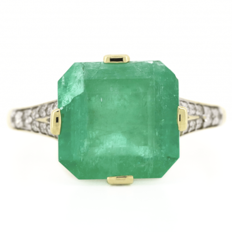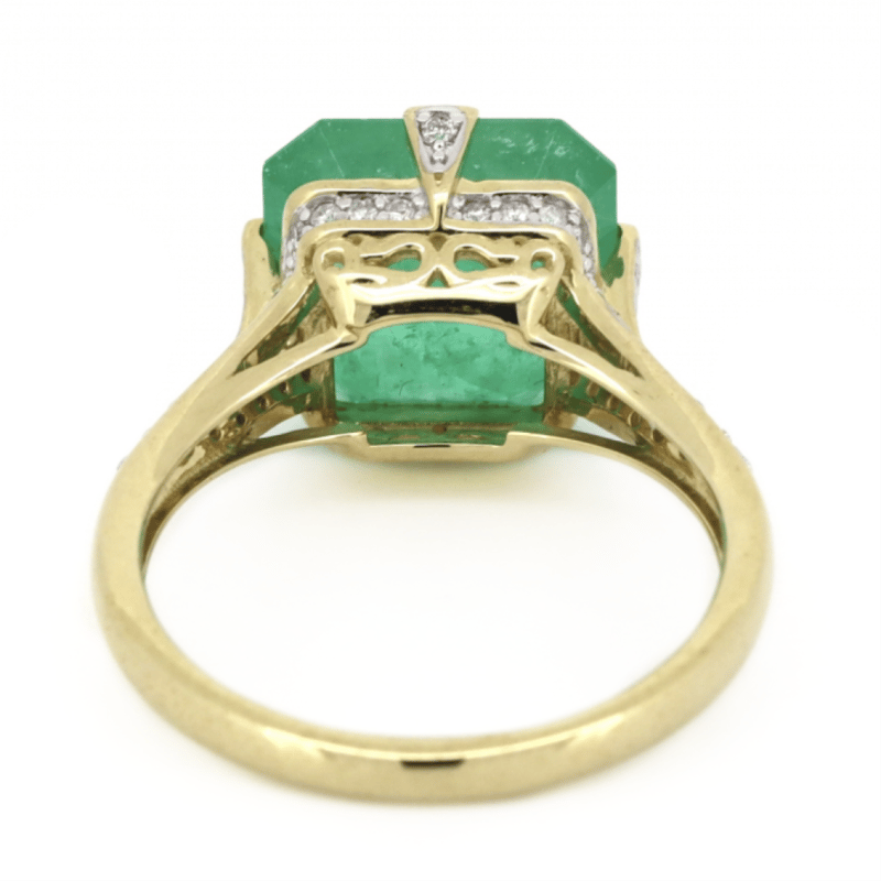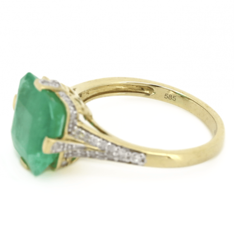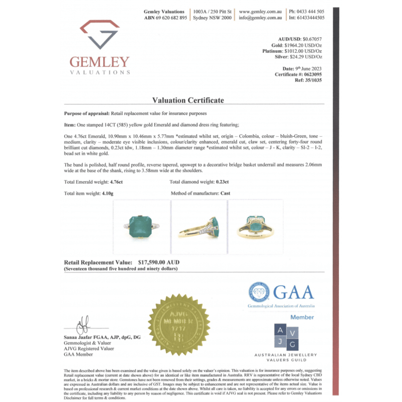 14K YELLOW GOLD, 4.76CT COLOMBIAN EMERALD AND DIAMOND, STATEMENT RING. The Centre Features, One Emerald Cut, Bluish-Green, Colombian Emerald (4.76Ct, Moderate Eye Visible Inclusions, Enhanced), Claw Set. Decorating The Setting Are, 44 Round Brilliant Cut, Diamonds (0.23Ct Tdw, J-K Colour, Si2-I2 Clarity), Bead Set In White Gold. Ring Size O. The Emerald Has A Natural Inclusion That Has Reached The Surface. Valuations Provided by an Independent Third-Party Professional Not Directly Associated With Lloyds Auctions at AUD $$17,590.00This valuation has been conducted by an independent third-party professional. The valuation amount is an assessment by the issuing valuer and does not reflect the auction value of the item. Any inquiries regarding the valuation should be directed to the issuing valuer (refer to contact details on the certificate), as Lloyds Auctions has no affiliation or influence over the valuation, the valuer, or the stated amount. Condition: Good - Refer Images 0645947+36