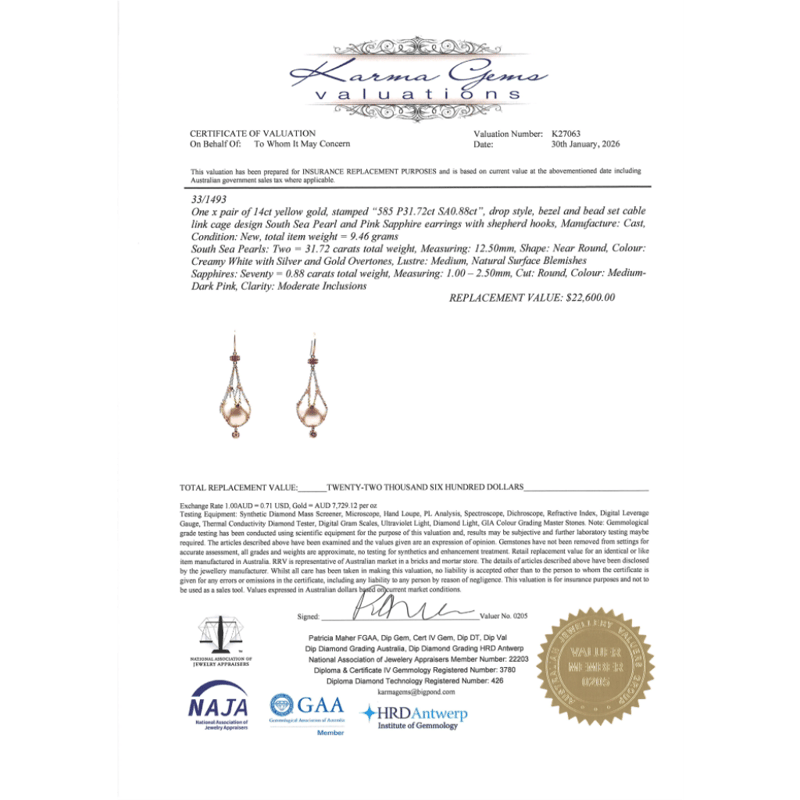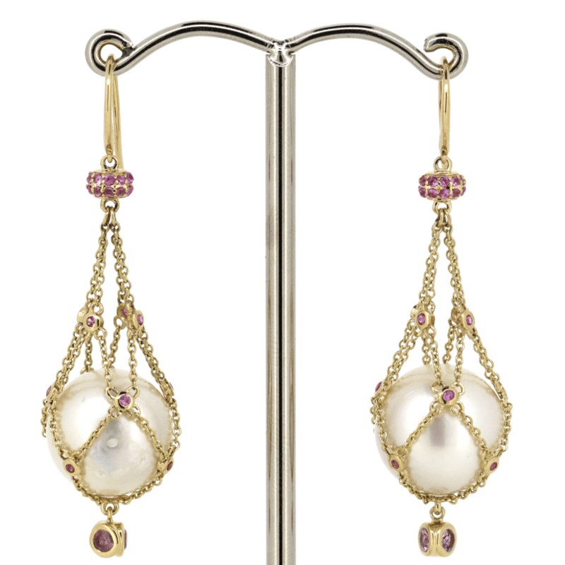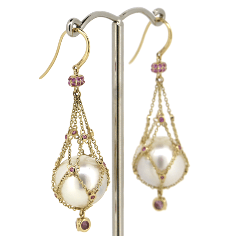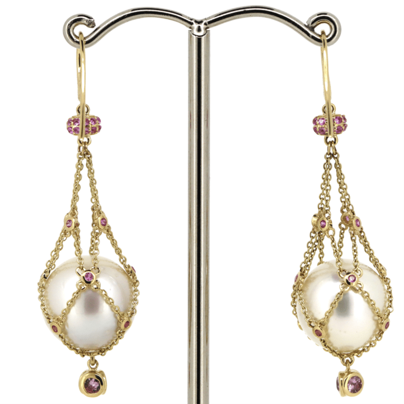 14K YELLOW GOLD, WHITE CULTURED SOUTH SEA PEARL, PINK SAPPHIRE AND DIAMOND, 'CAGE' EARRINGS. The Design Features, 2 Near Round, Creamy White With Silver And Gold Overtones, Cultured South Sea Pearls (31.72Ct/12.50Mm Size, Medium Lustre, Natural Surface Blemishes), Unset In Chain 'Cage' Drop. Decorating The Design Are, 70 Round Faceted Cut, Pink Sapphires (0.88Ct Tsw, Moderate Inclusions), Bezel/Bead Set. The Earrings Have Shepherds Hooks. Valuations Provided by an Independent Third-Party Professional Not Directly Associated With Lloyds Auctions at AUD $$0.00This valuation has been conducted by an independent third-party professional. The valuation amount is an assessment by the issuing valuer and does not reflect the auction value of the item. Any inquiries regarding the valuation should be directed to the issuing valuer (refer to contact details on the certificate), as Lloyds Auctions has no affiliation or influence over the valuation, the valuer, or the stated amount. Condition: Good - Refer Images 0645947+41