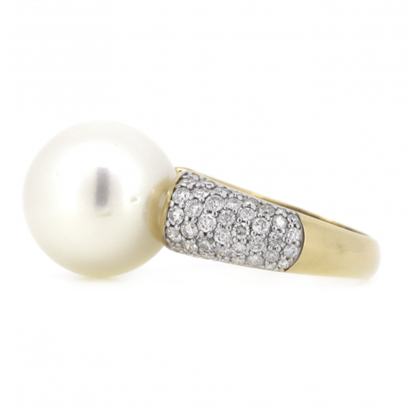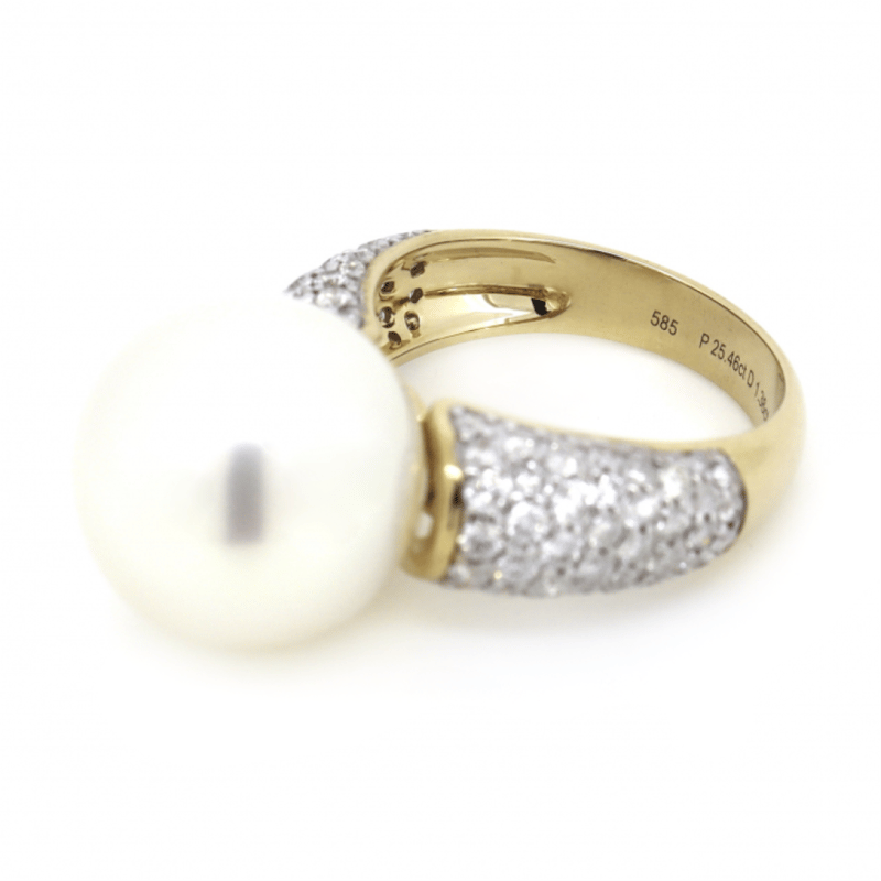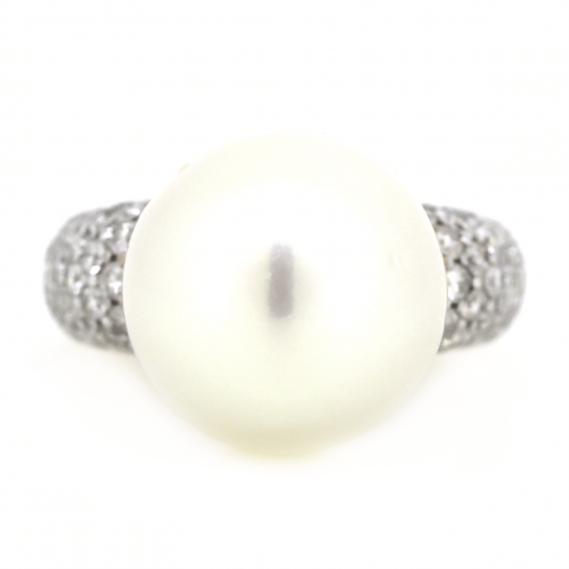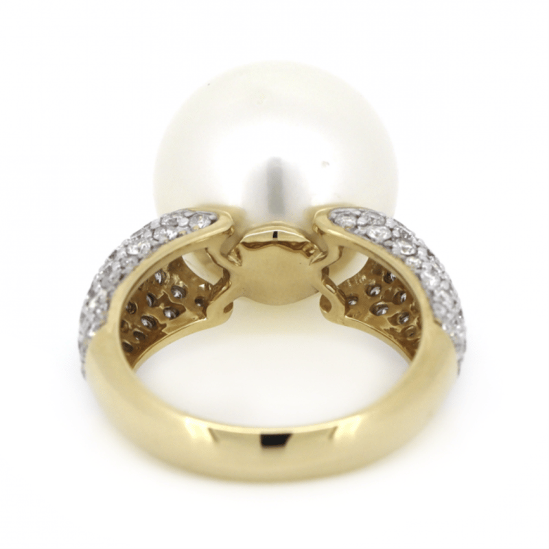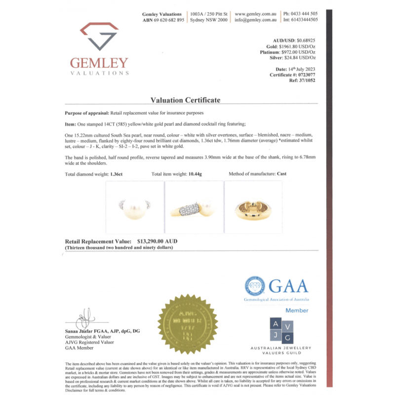 14K YELLOW GOLD, WHITE CULTURED SOUTH SEA PEARL AND DIAMOND, COCKTAIL RING. The Centre Features, One Near Round, White With Silver Overtones, Cultured South Sea Pearl (15.22Mm Size, Medium Lustre, Blemished). Decorating The Band Are, 84 Round Brilliant Cut, Diamonds (1.36Ct Tdw, J-K Colour, Si2-I2 Clarity), Pave Set In White Gold. Ring Size N. Valuations Provided by an Independent Third-Party Professional Not Directly Associated With Lloyds Auctions at AUD $$13,290.00This valuation has been conducted by an independent third-party professional. The valuation amount is an assessment by the issuing valuer and does not reflect the auction value of the item. Any inquiries regarding the valuation should be directed to the issuing valuer (refer to contact details on the certificate), as Lloyds Auctions has no affiliation or influence over the valuation, the valuer, or the stated amount. Condition: Good - Refer Images 0645947+42