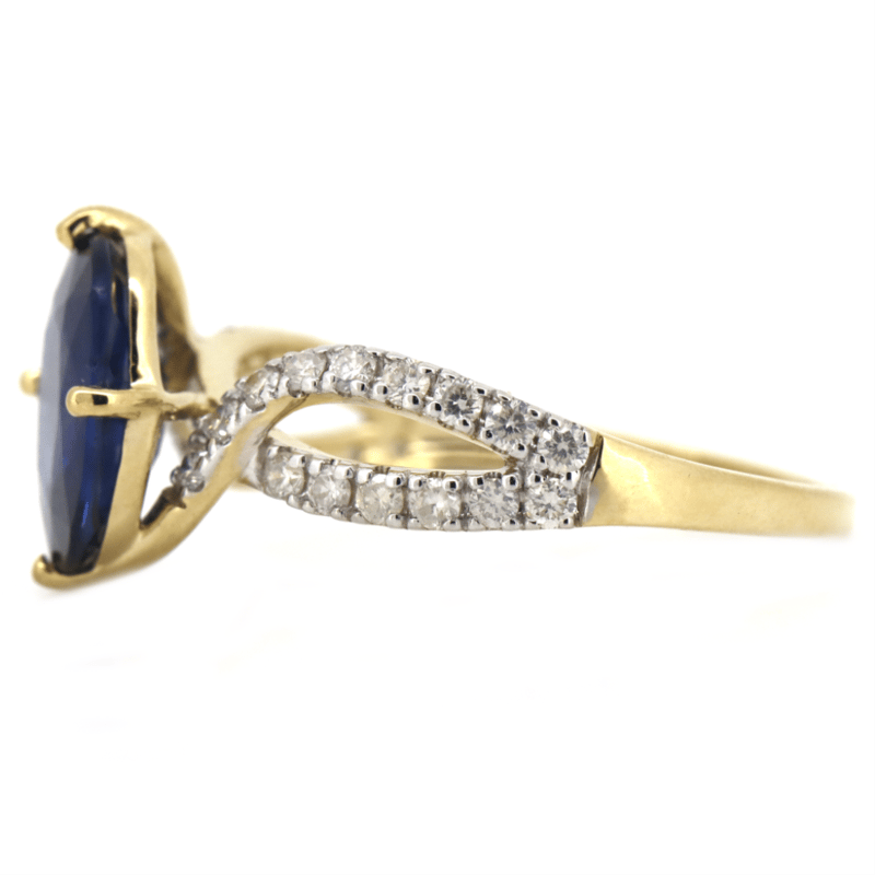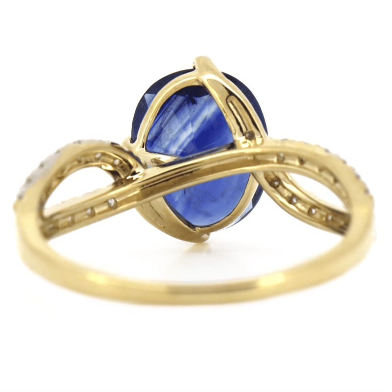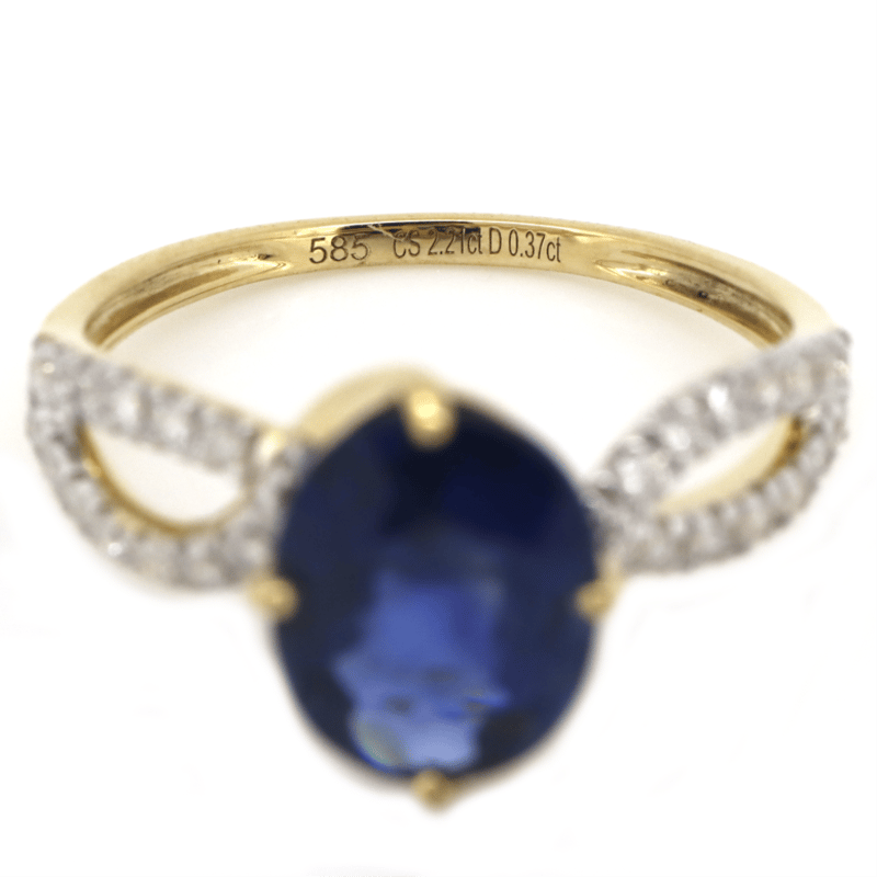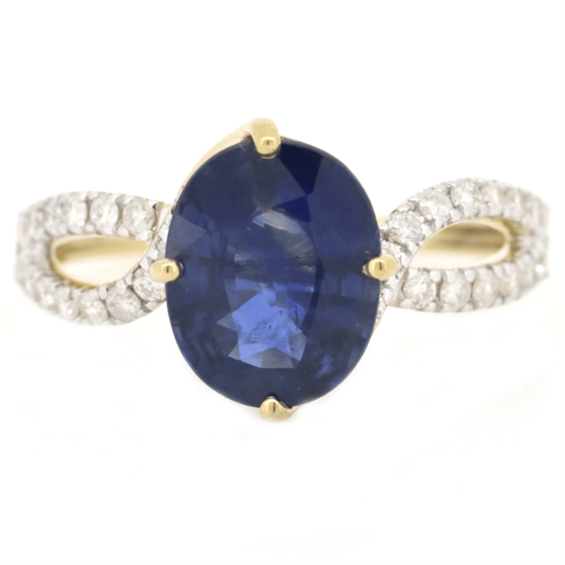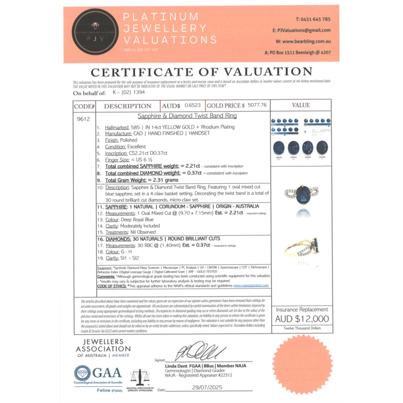 14K YELLOW GOLD, SAPPHIRE AND DIAMOND, TWIST BAND RING. The Centre Features, One Oval Cut, Sapphire (2.21Ct, Moderately Included), Claw Set. Decorating The Twist Band Are, 30 Round Brilliant Cut, Diamonds (0.37Ct Tdw, G-H Colour, Si1-Si2 Clarity), Micro-Claw Set In White Gold. Ring Size M 1/2. Valuations Provided by an Independent Third-Party Professional Not Directly Associated With Lloyds Auctions at AUD $$12,000.00This valuation has been conducted by an independent third-party professional. The valuation amount is an assessment by the issuing valuer and does not reflect the auction value of the item. Any inquiries regarding the valuation should be directed to the issuing valuer (refer to contact details on the certificate), as Lloyds Auctions has no affiliation or influence over the valuation, the valuer, or the stated amount. Condition: Good - Refer Images 0645947+50
