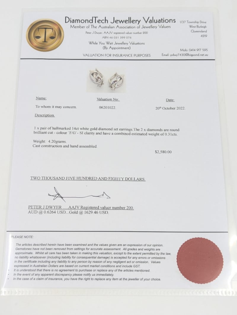 14K White Gold Diamond Earrings, Earrings Feature One Round Brilliant Cut Diamond, Combined Estimated Weight: 0.31Ct, Valuation: $2,580
