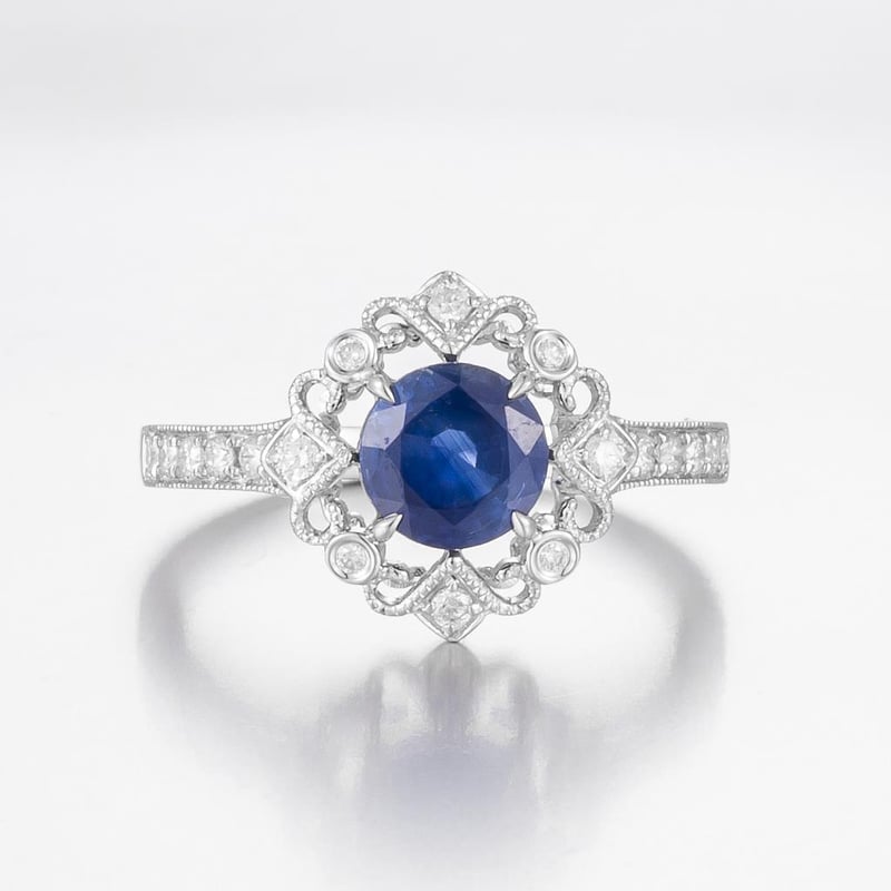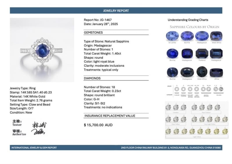 14CT WHITE GOLD MADAGASCAN SAPPHIRE AND DIAMOND VINTAGE STYLE RING Feature Centre, One Round Cut, Light Royal Blue Madagascan Sapphire (1.40Ct, Moderate Inclusions), Claw Set, With 18 Round Brilliant Cut Diamonds (0.23Ct Tdw, G-H Colour, Si1-Si2 Clarity) Bead Set. Ring Size O. Valuations Provided by an Independent Third-Party Professional Not Directly Associated With Lloyds Auctions at AUD $15700This valuation has been conducted by an independent third-party professional. The valuation amount is an assessment by the issuing valuer and does not reflect the auction value of the item. Any inquiries regarding the valuation should be directed to the issuing valuer (refer to contact details on the certificate), as Lloyds Auctions has no affiliation or influence over the valuation, the valuer, or the stated amount. Condition: Good - Refer Images 0582871+1920